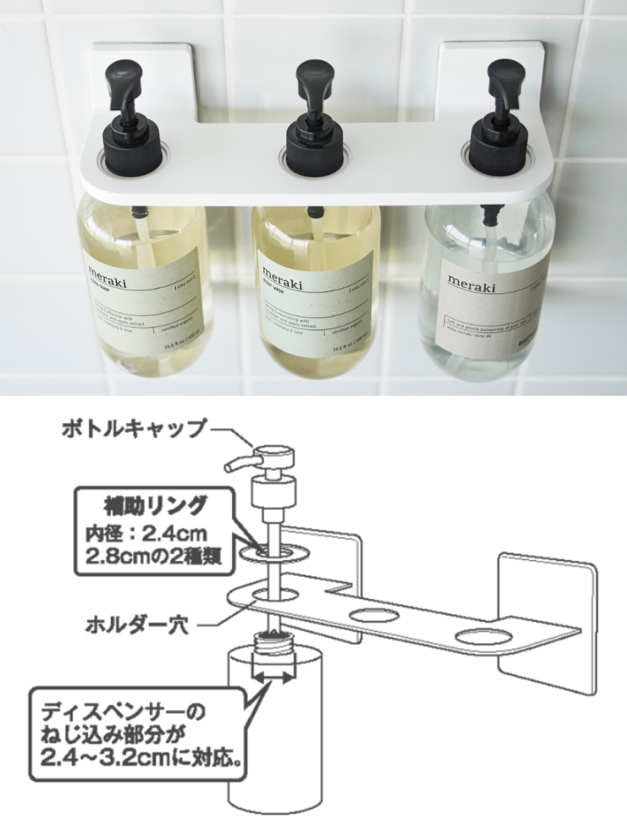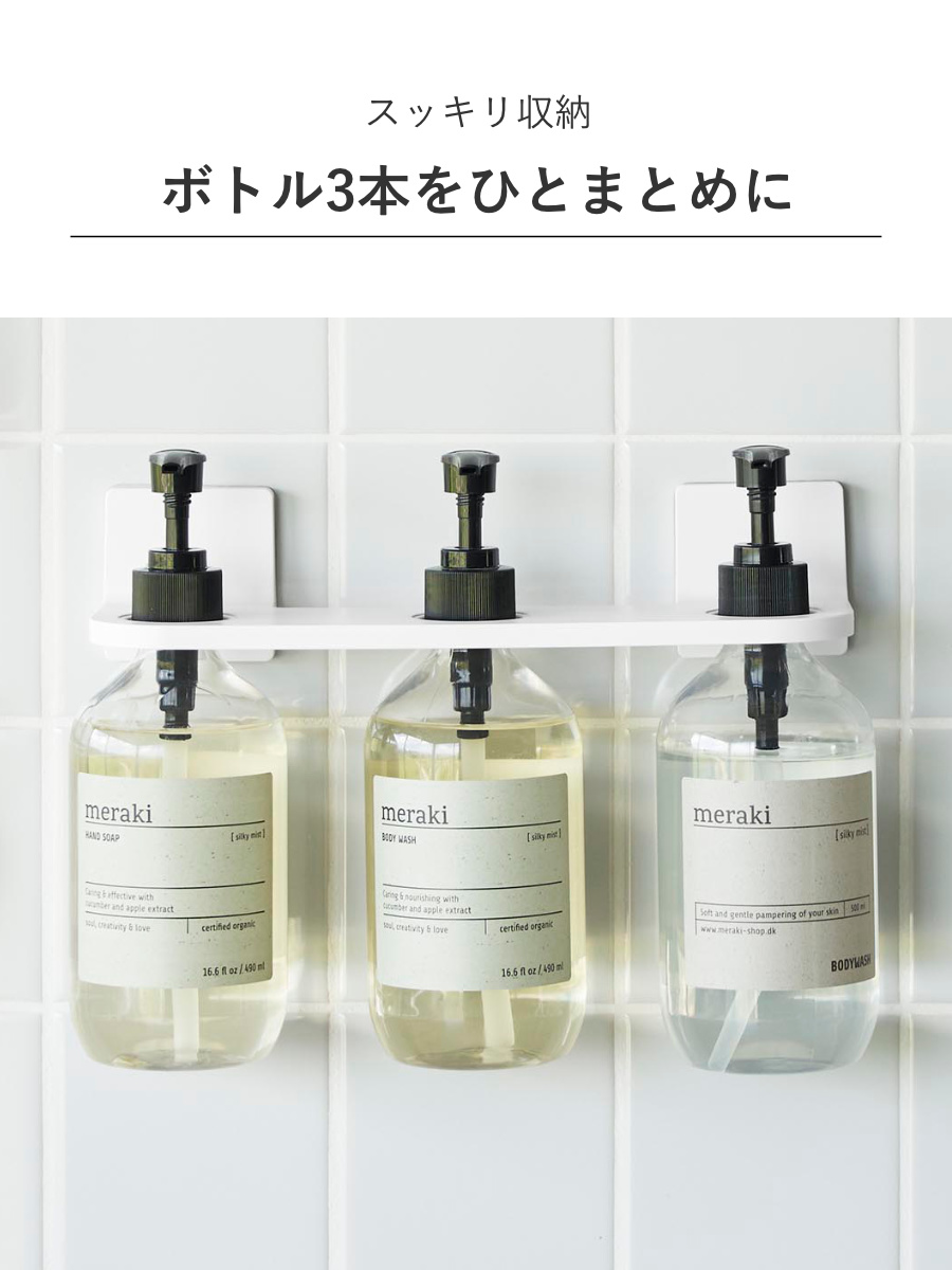 ボディソープやシャンプー、コンディショナーなどのディスペンサーボトル3本を1つのホルダーにまとめてスッキリ収納できます。