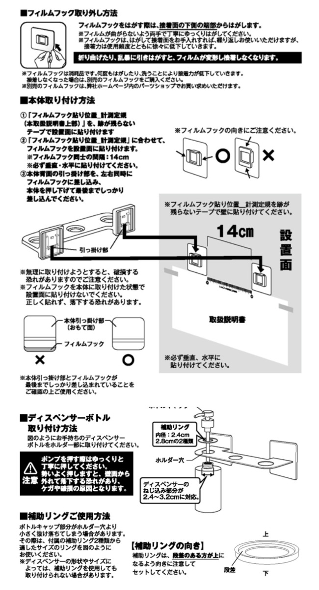 | 備考 | 容量約 500mLのボトルを目安にしています 使用できる面:光沢のある平らな油染みしない面で、フィルムフックの接着面よりも大きい面(タイル・プラスチック・ステンレス・金属塗装面・人工大理石) |