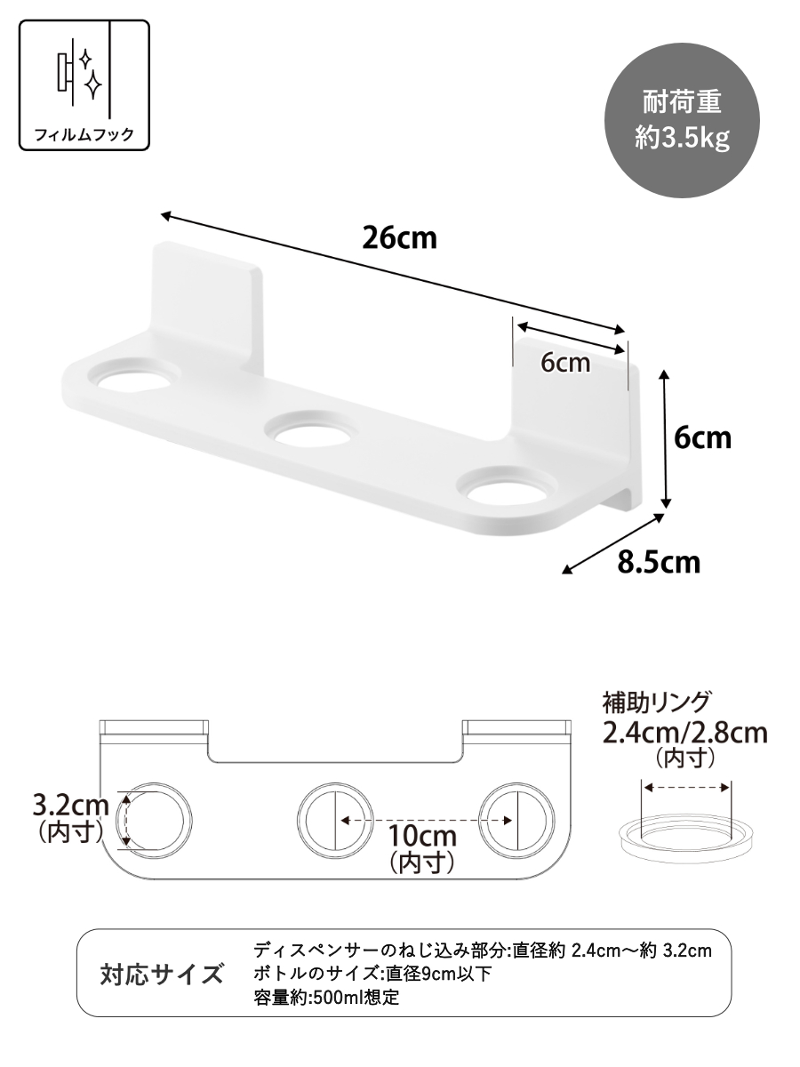 | サイズ | 【本体】 幅約 26×奥行約 8.5×高さ約 6(cm)(フィルムフック含まず) 【フィルムフック接着面】 幅約 6×高さ約 6(cm) 【ホルダー穴1か所あたり】 直径約 3.2(cm) 【補助リング】内径約 2.4cm・2.8cm 外径約 4cm |