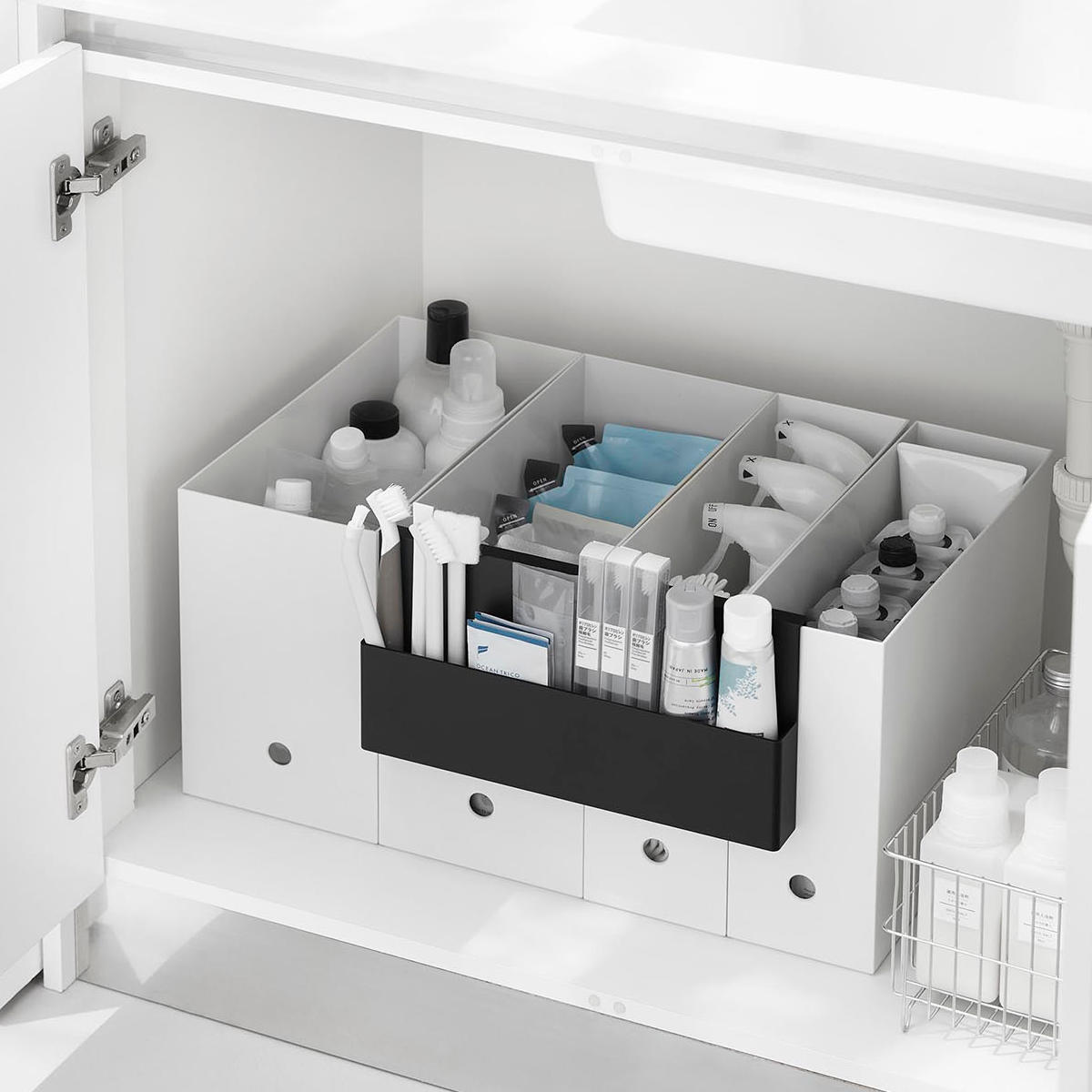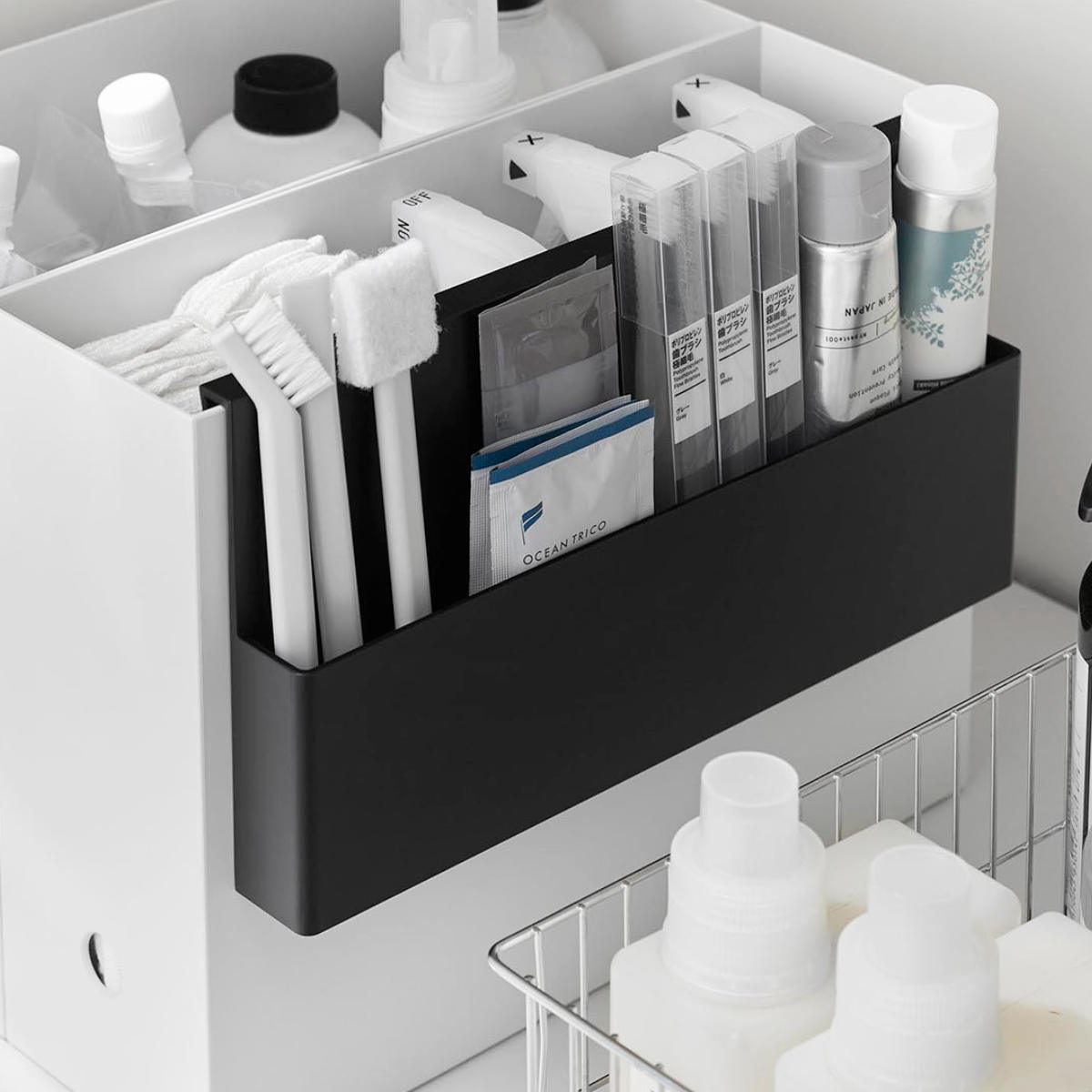 ファイルボックスやワゴンに引っ掛けて使える収納ホルダーです。洗面周りの小物整理に便利で、歯ブラシや歯磨き粉のストック、小さなお掃除ブラシなどをスッキリ収納できます。