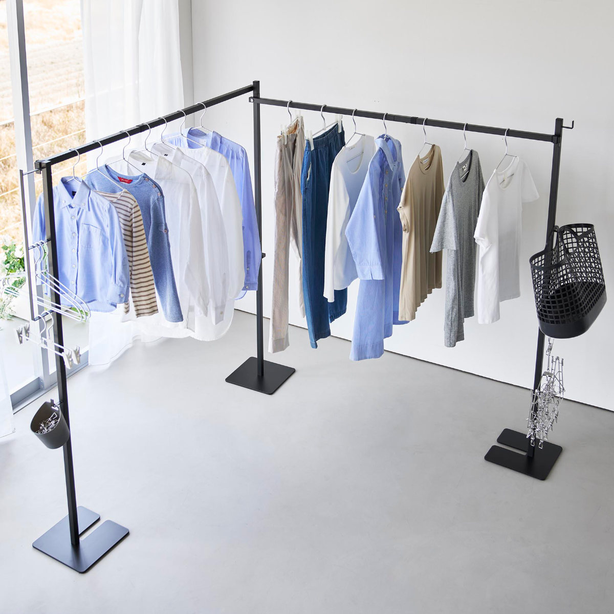 室内での部屋干しに便利な2連の物干しスタンドです。広げたりL字にしたりできる折り畳み式です。シーンによって様々な使い方ができます。