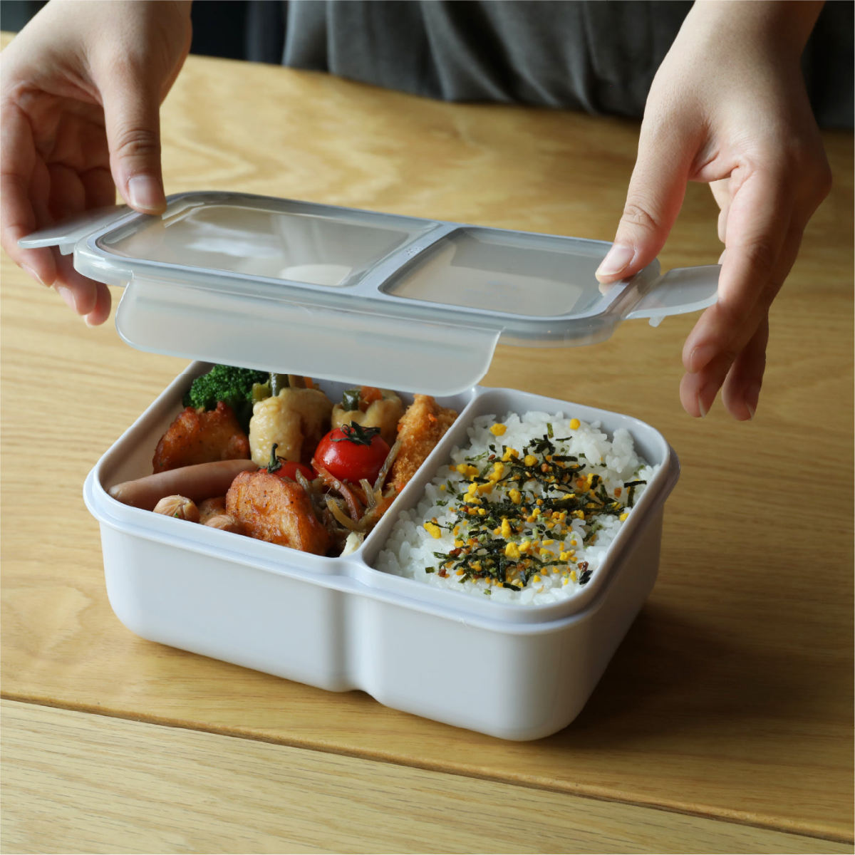本体と中仕切りそれぞれにシーリング構造を採用し、密閉性を高めたお弁当箱です。カバンの中に立てて入れてもおかずの汁が漏れにくく、通勤や通学など持ち運ぶときにも安心です。荷物が増える日でも、軽さと丈夫さを兼ね備えた実用性が嬉しいポイントです。