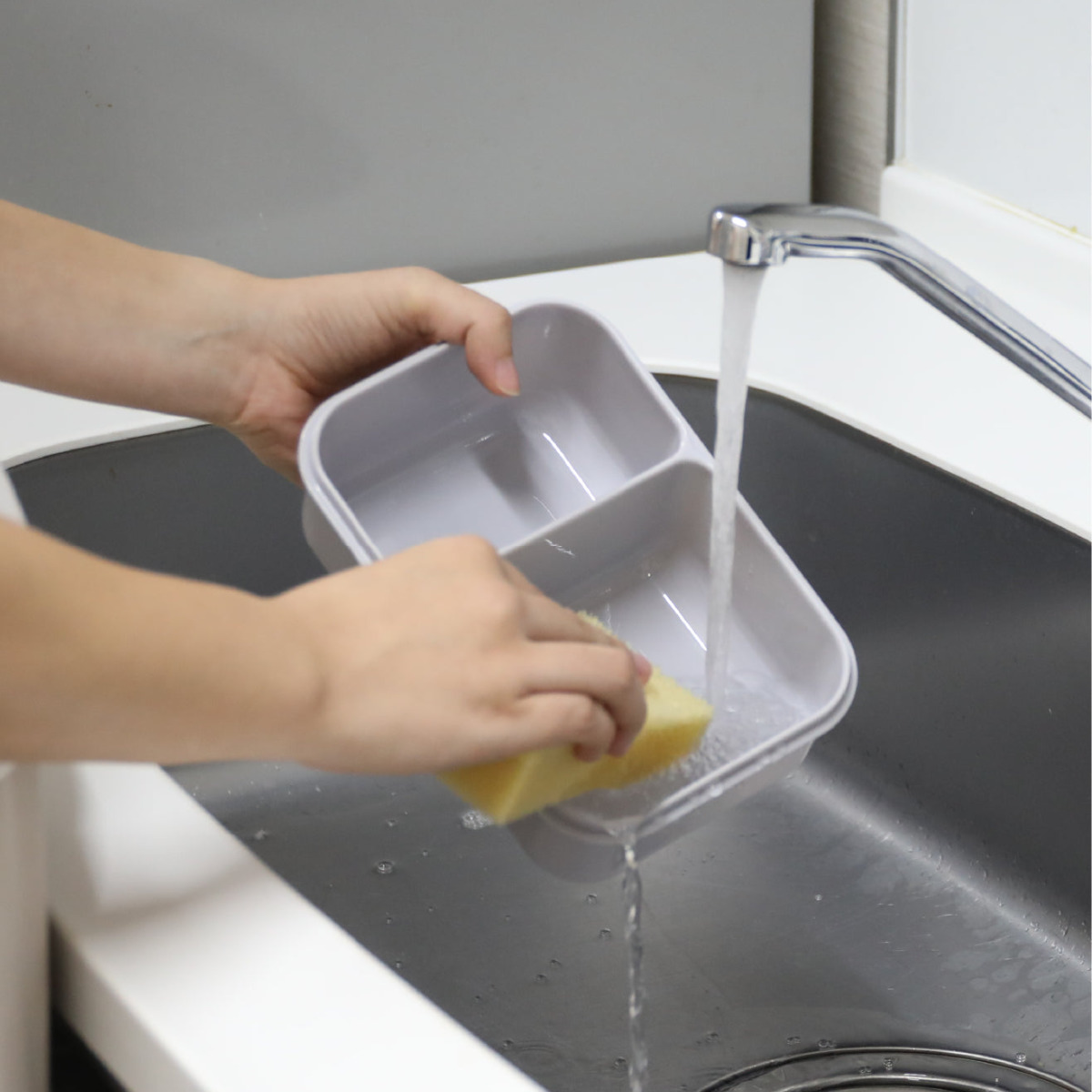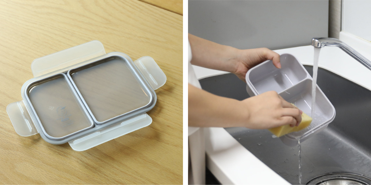 お弁当箱は蓋と本体の2パーツ構造です。汚れが入りにくい一体型パッキンの蓋と丸い角の本体はスポンジでも洗いやすいです。食洗機にも対応しているので、毎日のお手入れがラクにできます。