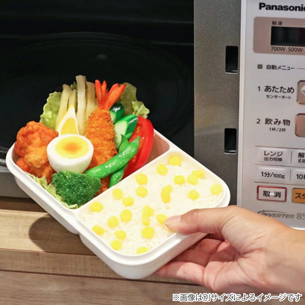 蓋を外すと電子レンジに対応しています。ランチタイムに温かいお弁当が楽しめます。