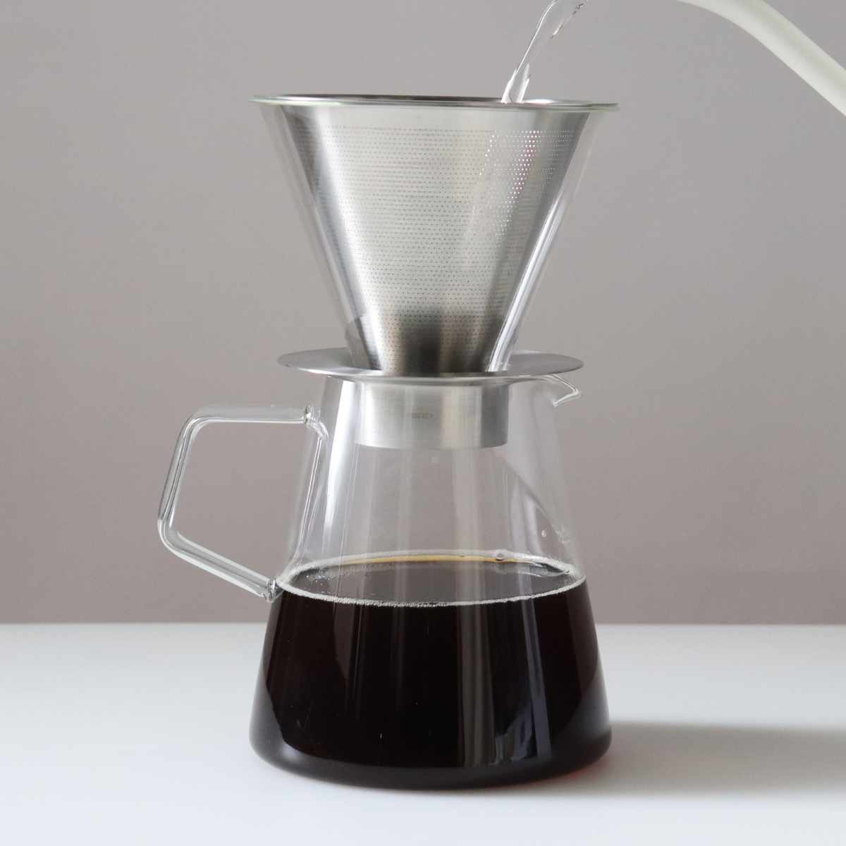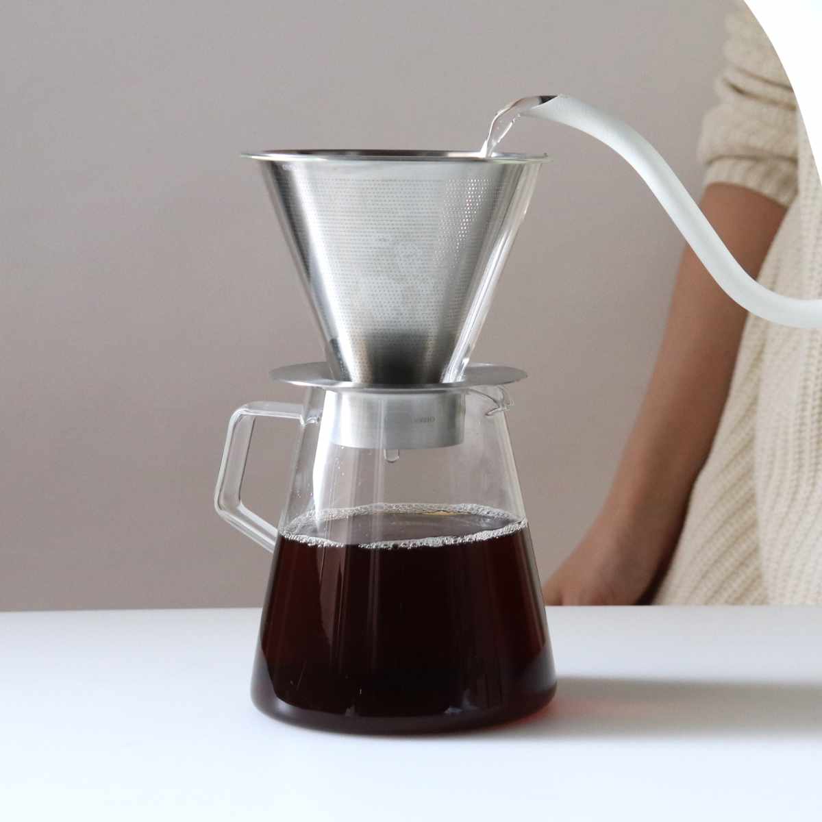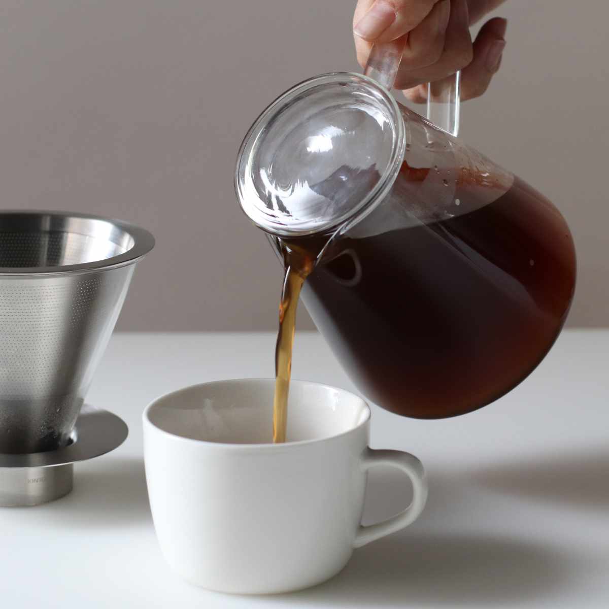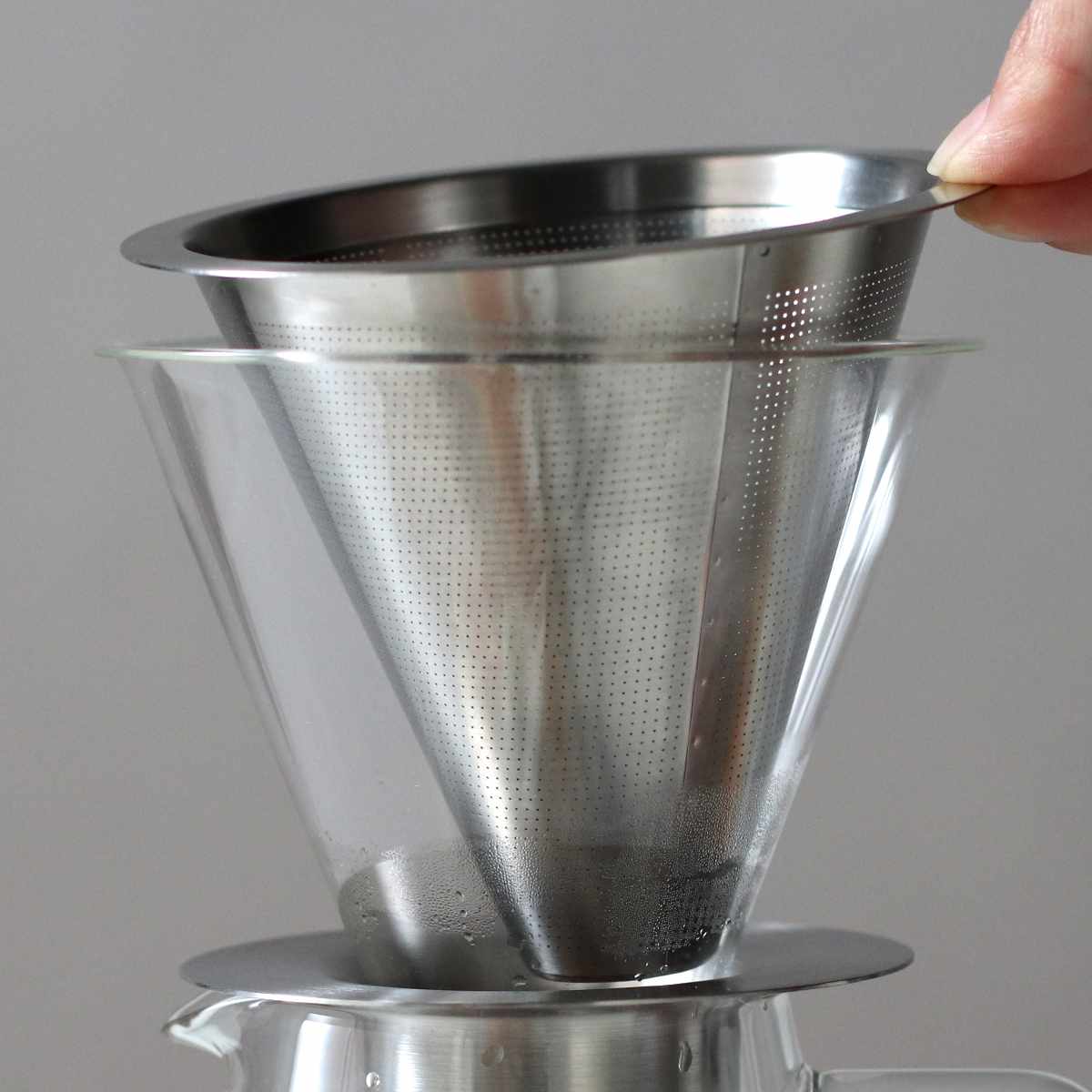 繰り返し、半永久的に使うことができるステンレス製のドリッパーと耐熱ガラス製のポットのセットです。ステンレスとガラスの組み合わせで美しく輝くドリンクウェア。円錐形のストレーナーとドリッパーが印象的なデザインです。