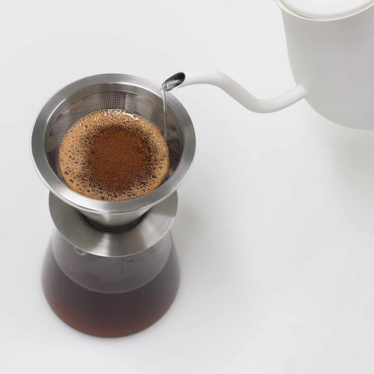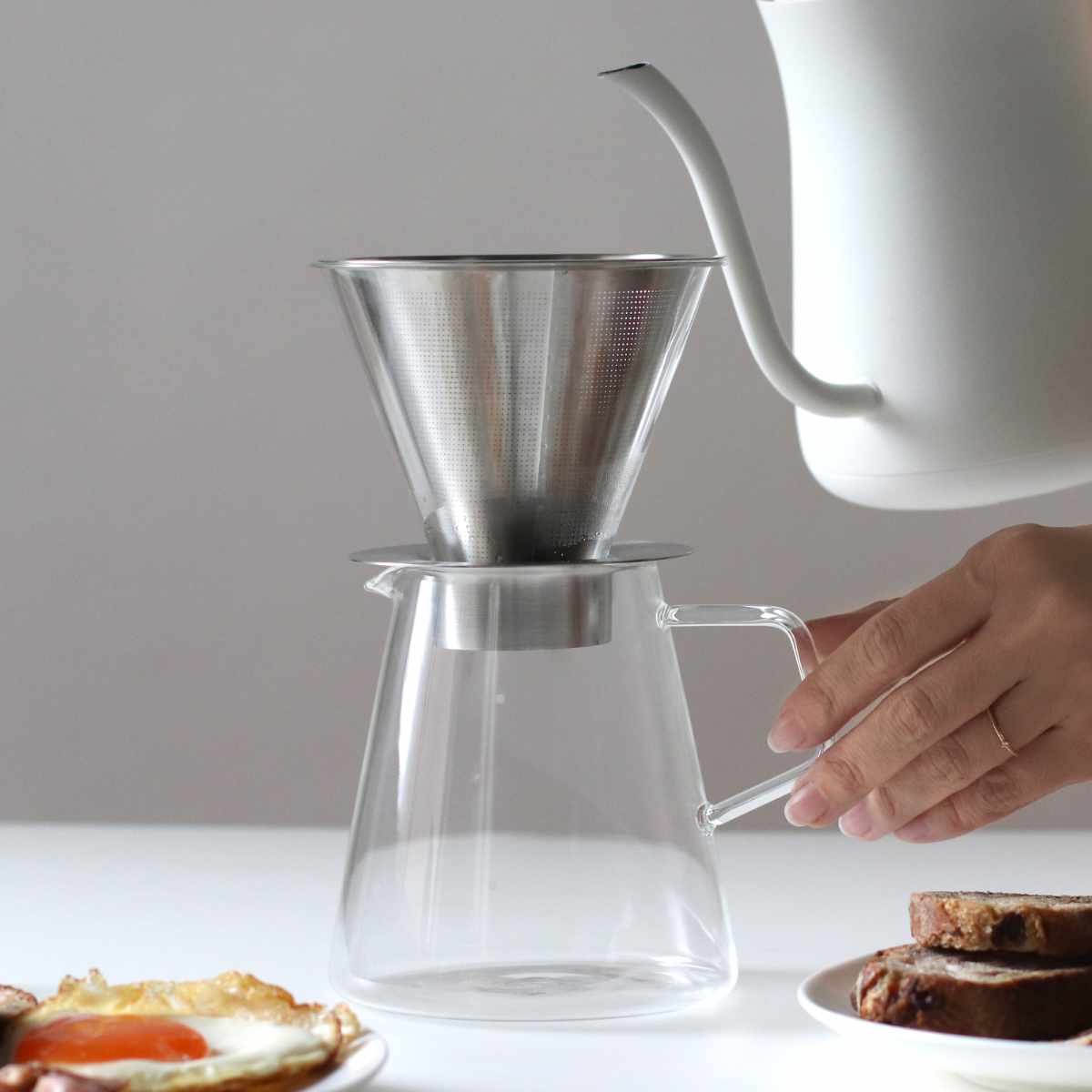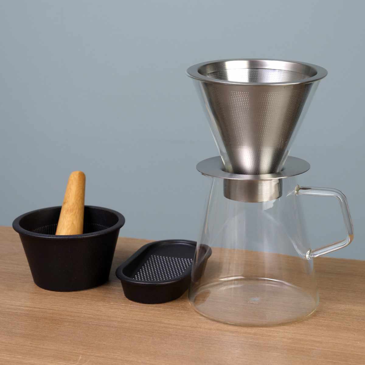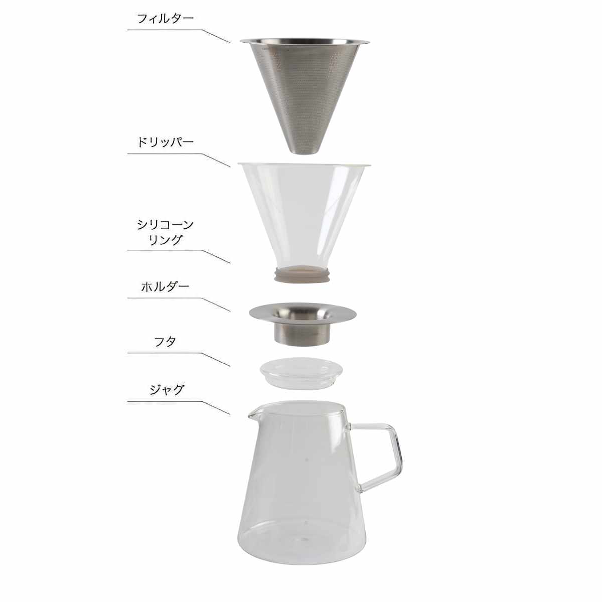 繰り返し、半永久的に使うことができるステンレス製のドリッパーと耐熱ガラス製のポットのセットです。ステンレスとガラスの組み合わせで美しく輝くドリンクウェア。円錐形のストレーナーとドリッパーが印象的なデザインです。