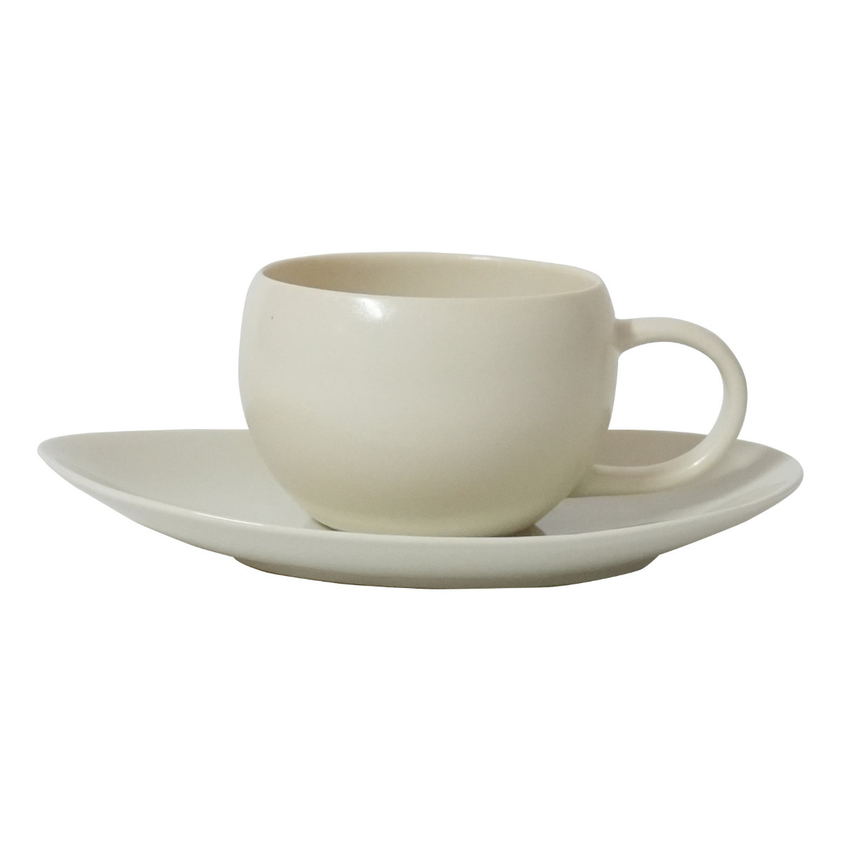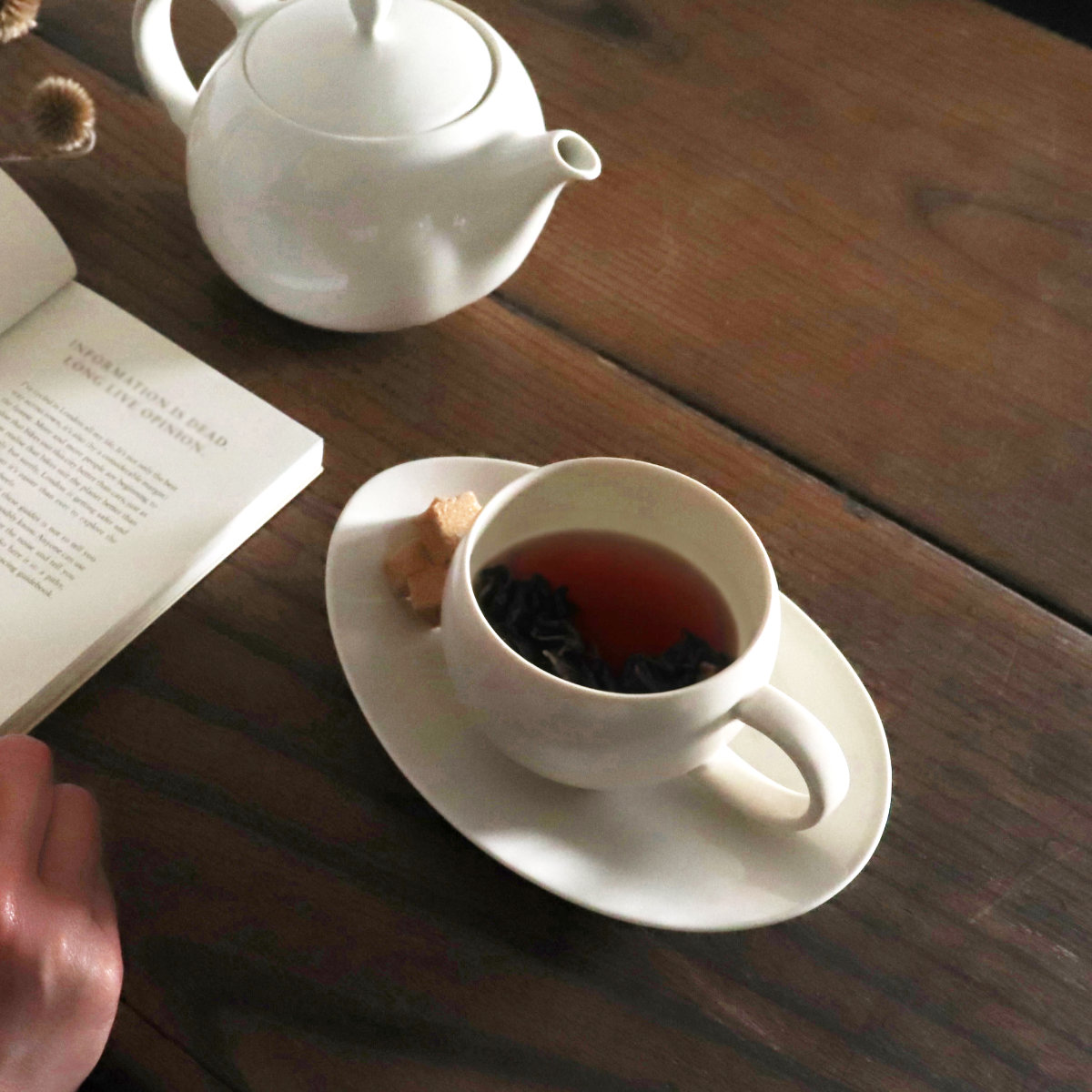 丸みのあるフォルムで手にすっと収まりやすく、見た目にも手触りにもやさしいデザインです。ティーカップだけでなく、スープカップ、デザートカップ、小さな鉢としても使えます。ソーサーは小さな焼き菓子やお菓子、おつまみを載せたり、デザート皿や取り皿としても使いやすいです。