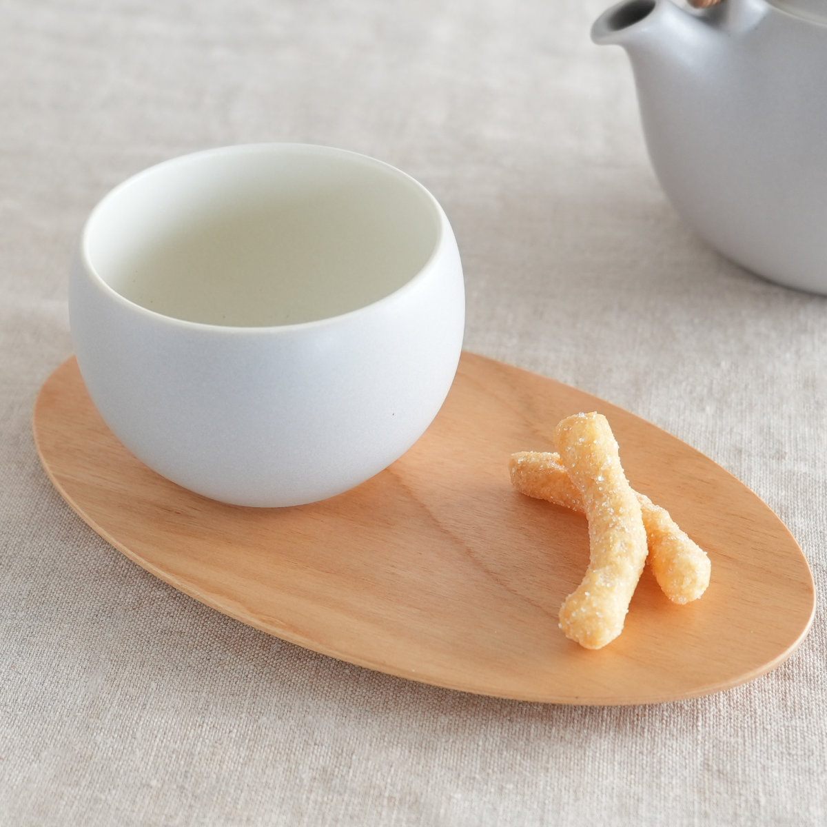 国産の山桜材を贅沢に使用した、上質な佇まいの楕円型茶敷です。楕円形のやさしいフォルムは手に取りやすく、コースターはもちろん湯呑みとお菓子を一緒に載せたりデザインプレートとして映えるデザインです。