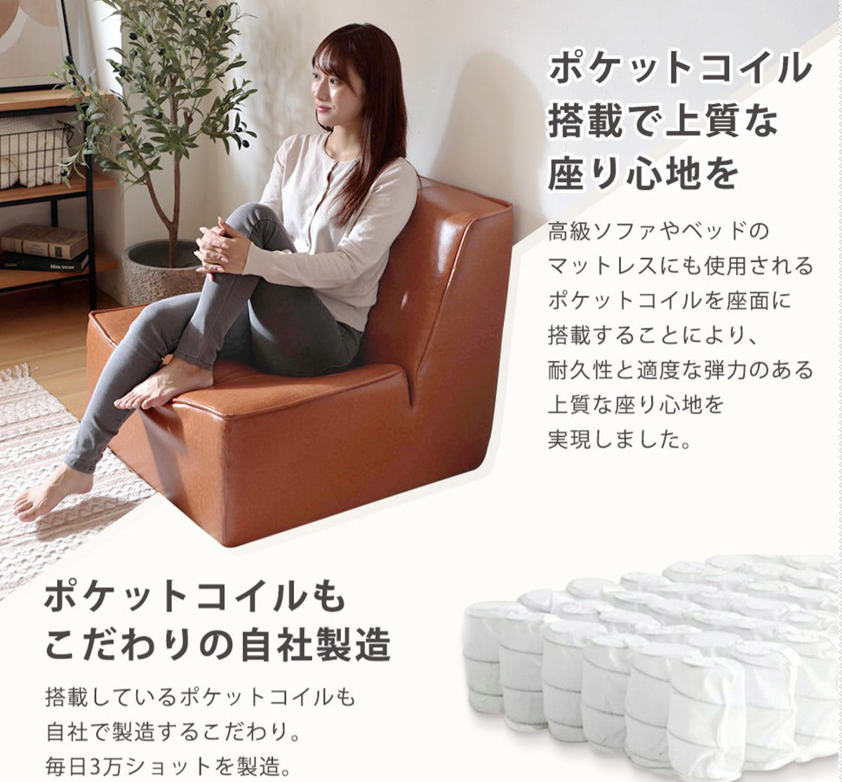 | 材質 | 張地:PVCレザー 構造部材:スチールパイプ、ポケットコイルスプリング 中身:ウレタン |