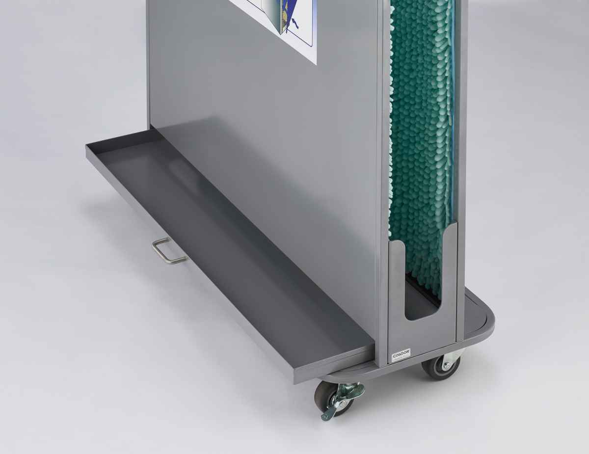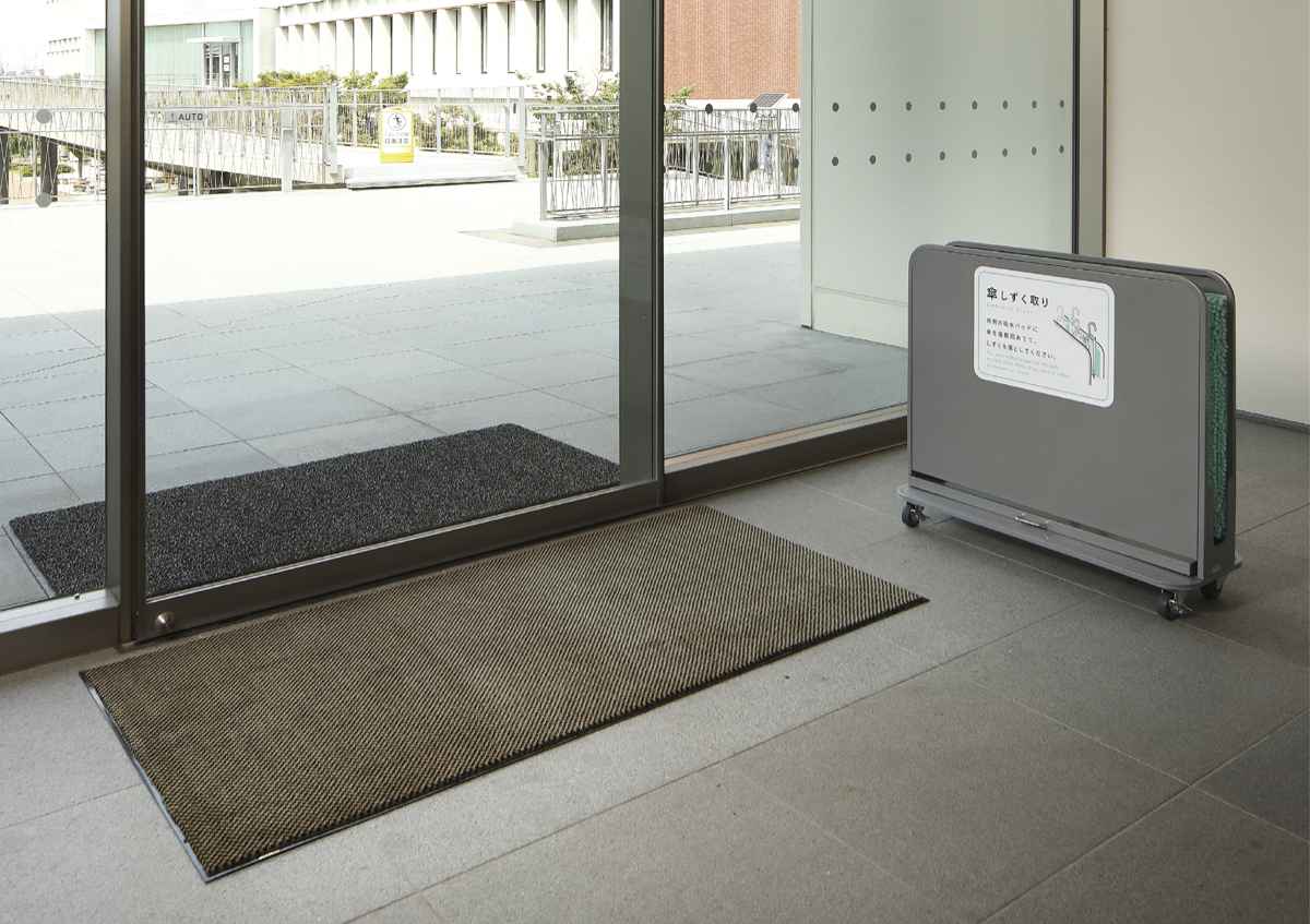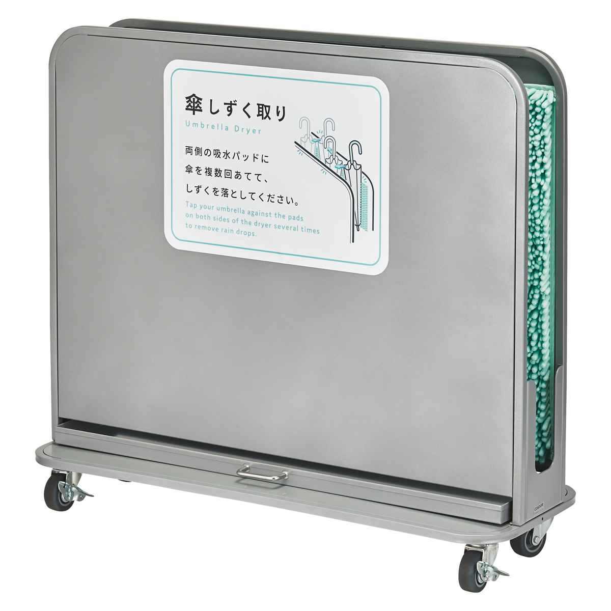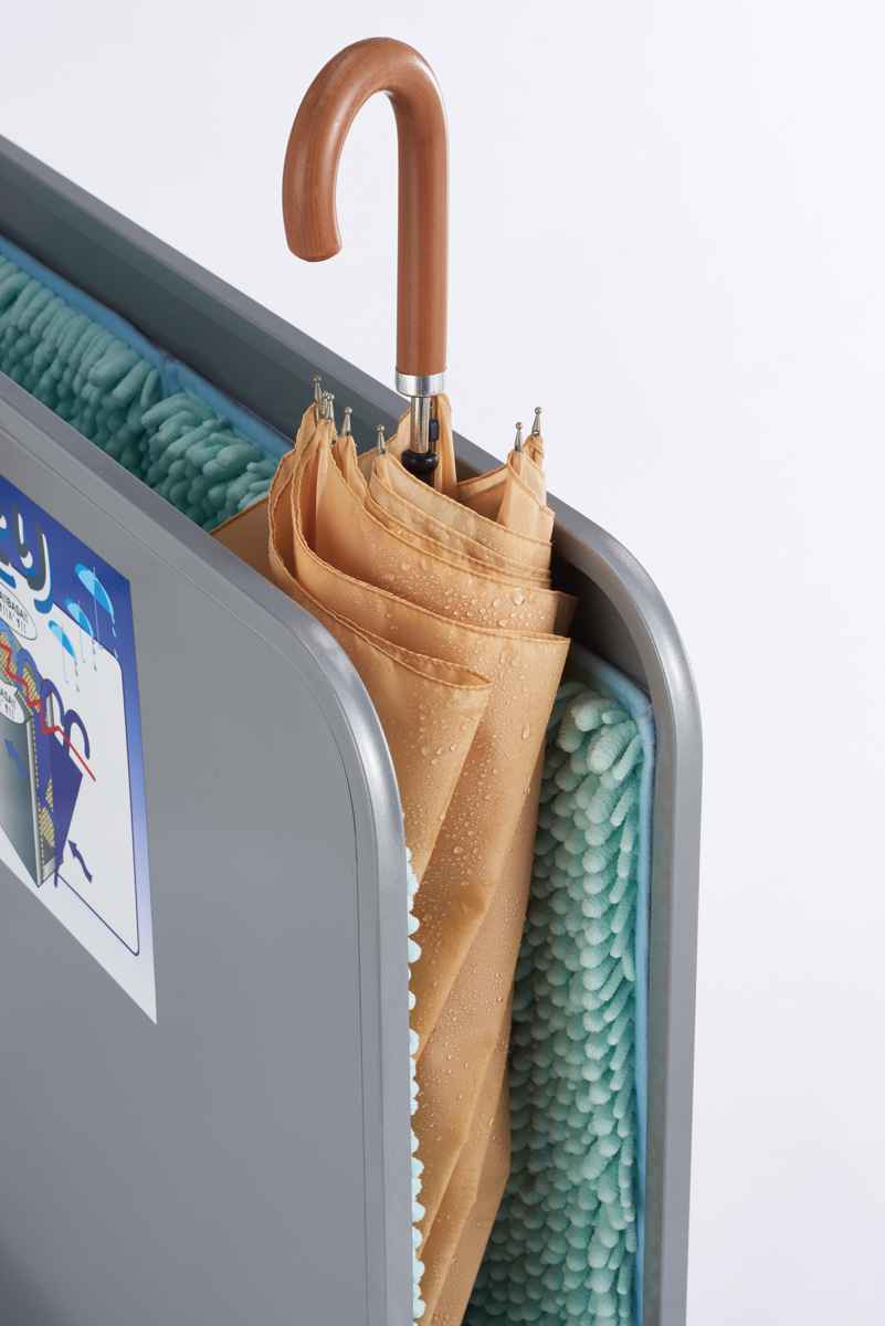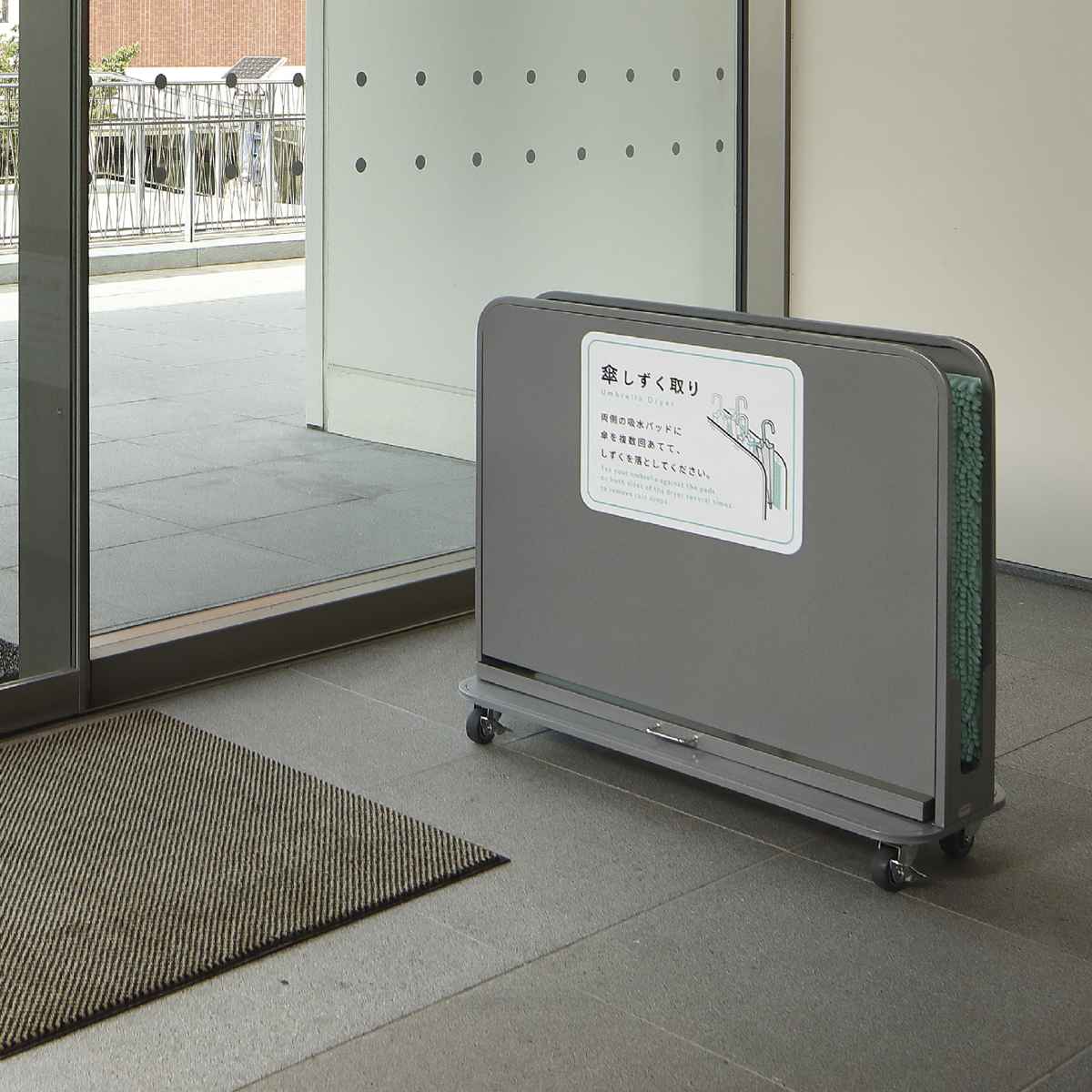 超吸水繊維が傘の雨滴を素早く吸収。傘を数回降るだけで、水滴を約40~60%除去できます。設置することで傘袋の削減にもつながります。