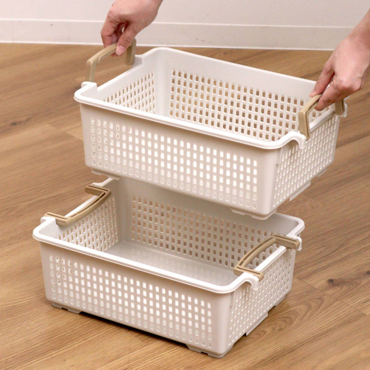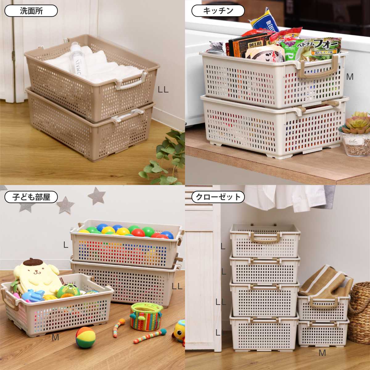 一つでも積み重ねて使ってもどこでも便利に使えるバスケット。キッチンでは食品ストック置き場に、ランドリーや洗面所ではタオルや洗剤の収納、棚の中のインナーケースとしてもお使いいただけます。散らかりがちな、小物やおもちゃや子供用品などの整理整頓に活躍します。