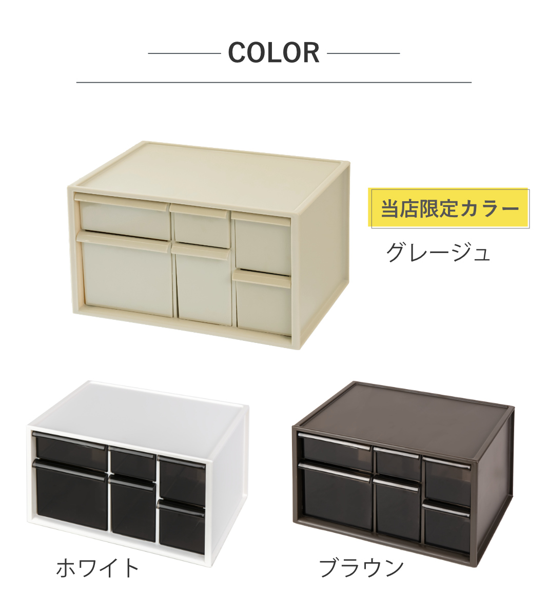 当店限定カラーの『グレージュ』は、引き出しも不透明のオールカラー仕様で中身が見えません。収納するだけで生活感を隠すことができるので、お部屋をよりスッキリとスタイリッシュな印象にしてくれます。