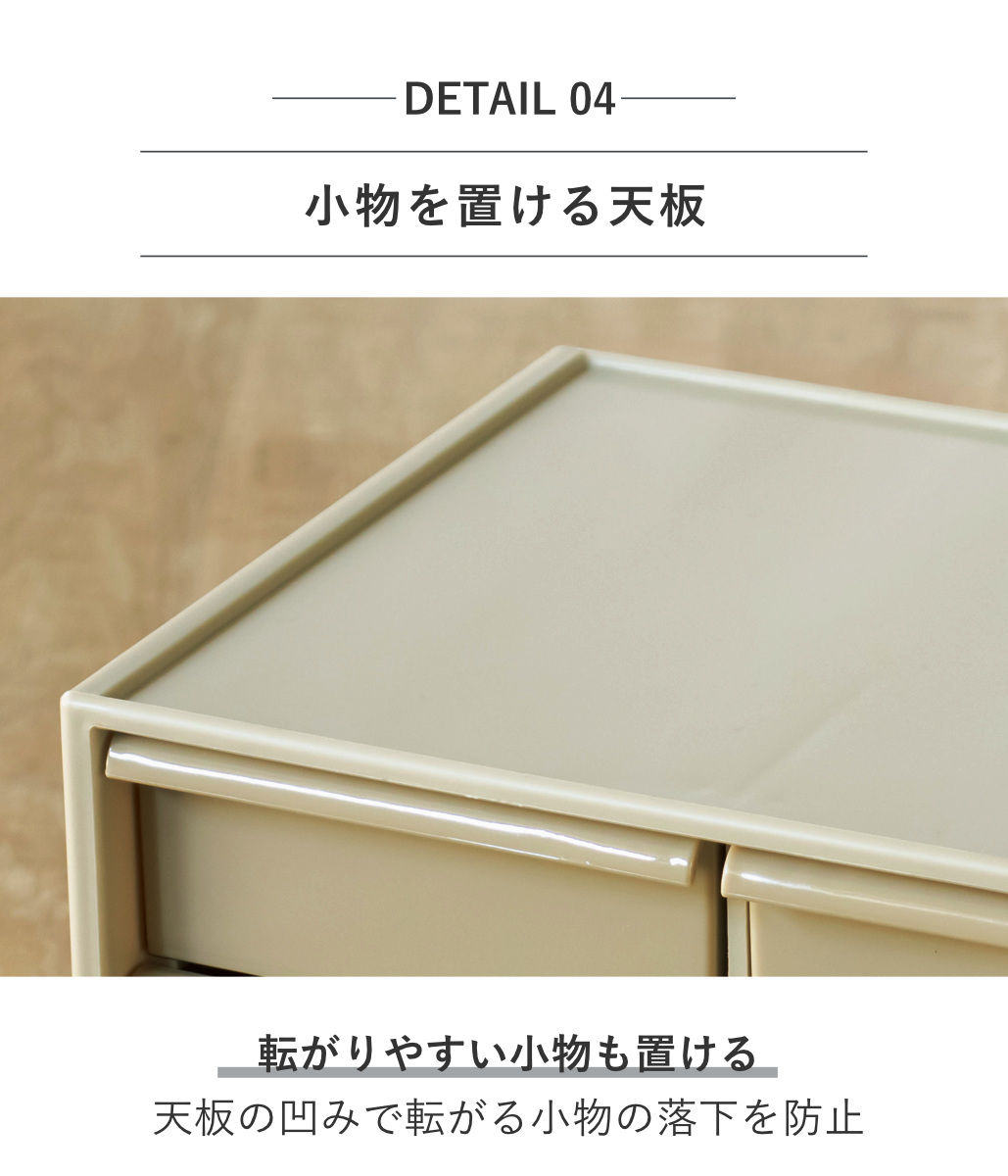 天板部分にはくぼみがあるので、スティックのりや印鑑などの転がりやすい小物を置いても落下しません。電卓やちょっとした軽量のインテリアなども置くことができます。