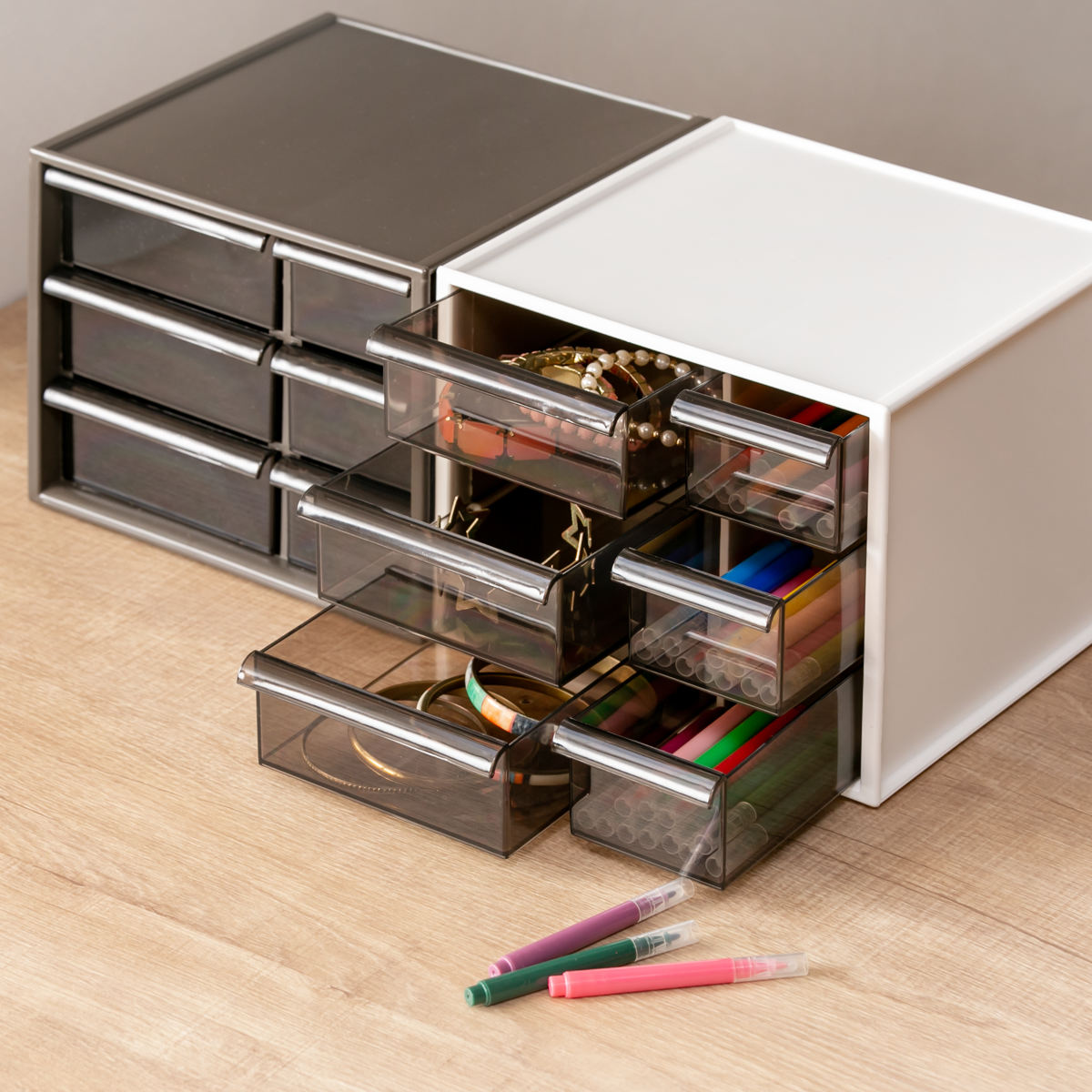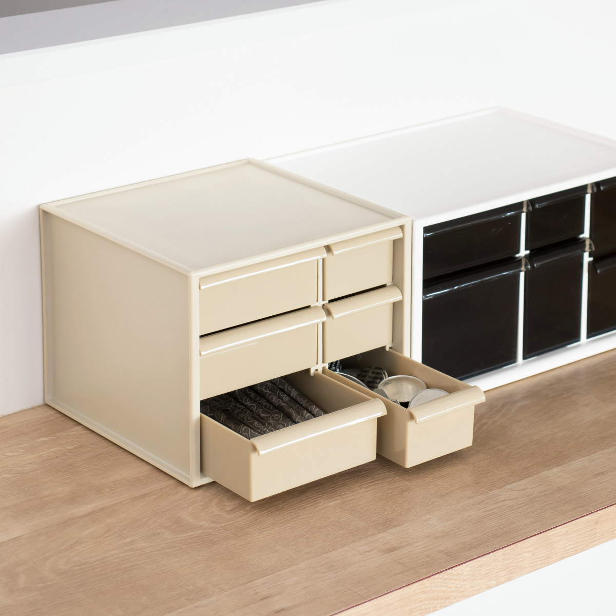 同サイズのアイケースは積み重ねが可能で、縦の空間を上手く活用できます。スペースの限られたデスク上であっても、積み重ねて使えば、収納容量を簡単に増やすことができます。
