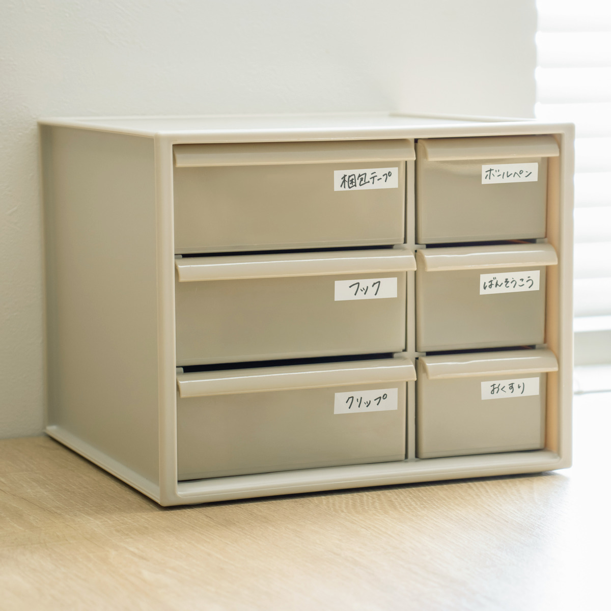 アイケースの引き出しにラベルを貼ることで中身が一目で分かりやすく、探す手間が減ります。特に中身の見えないグレージュカラーにはおすすめです。ラベルは、引き出しの前面や引き手部分など、お好みの場所に貼っていただけます。