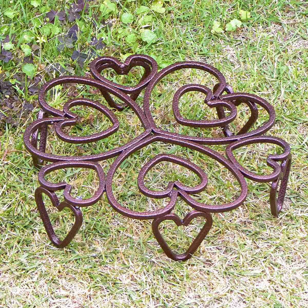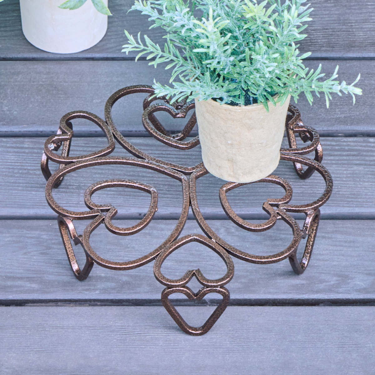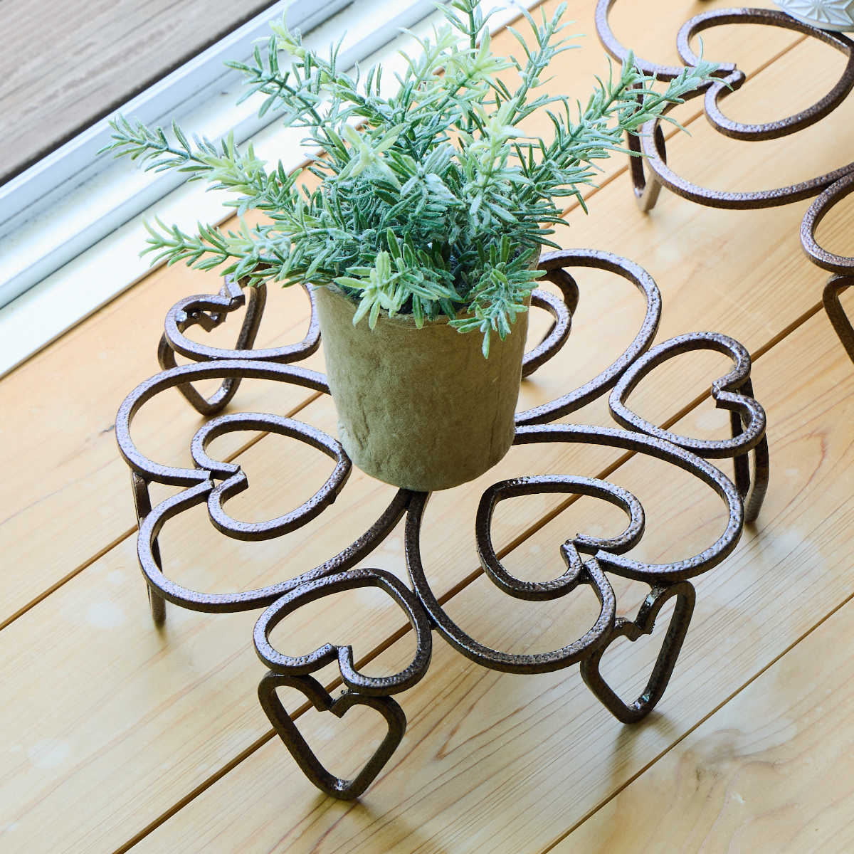 ハートをモチーフにしたアンティーク風のデザインがおしゃれ。丈夫なブロンズ製なので、重たい植木鉢もしっかり支えます。