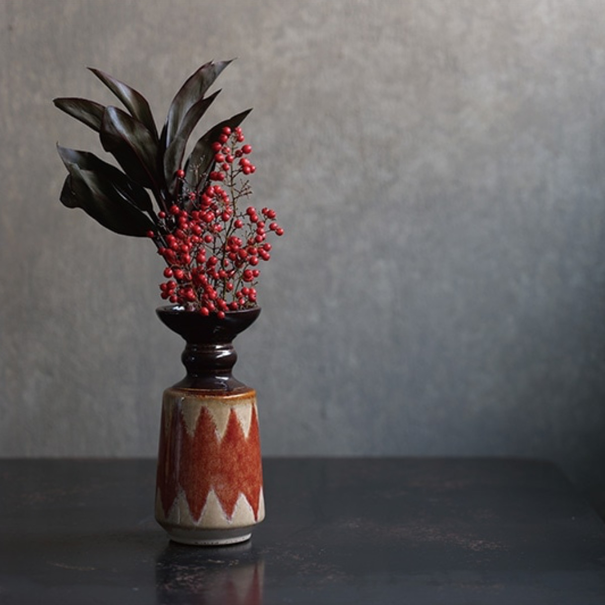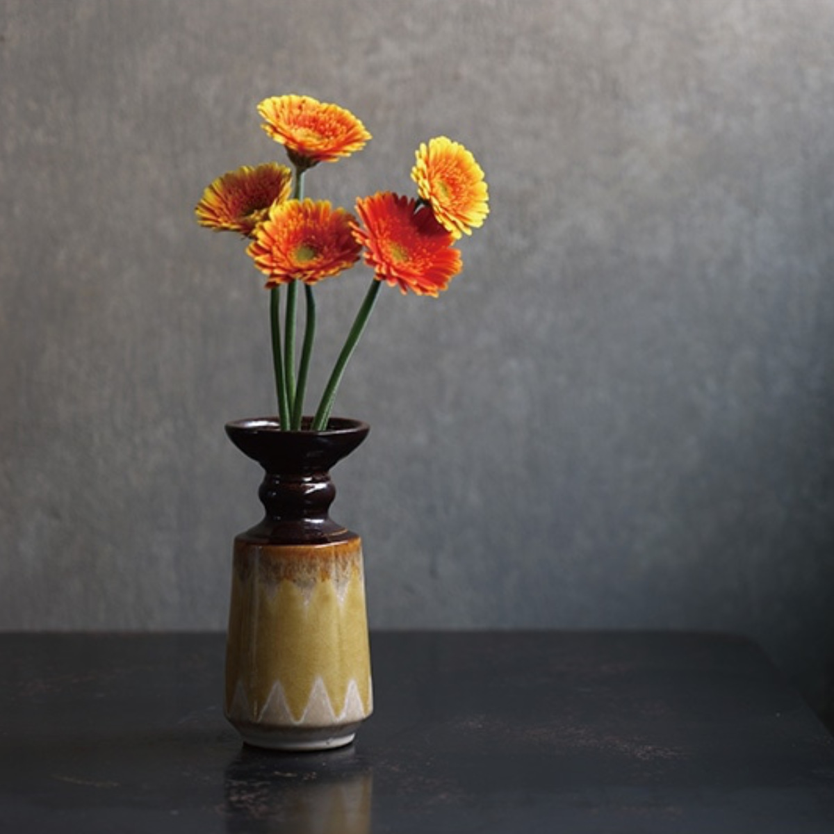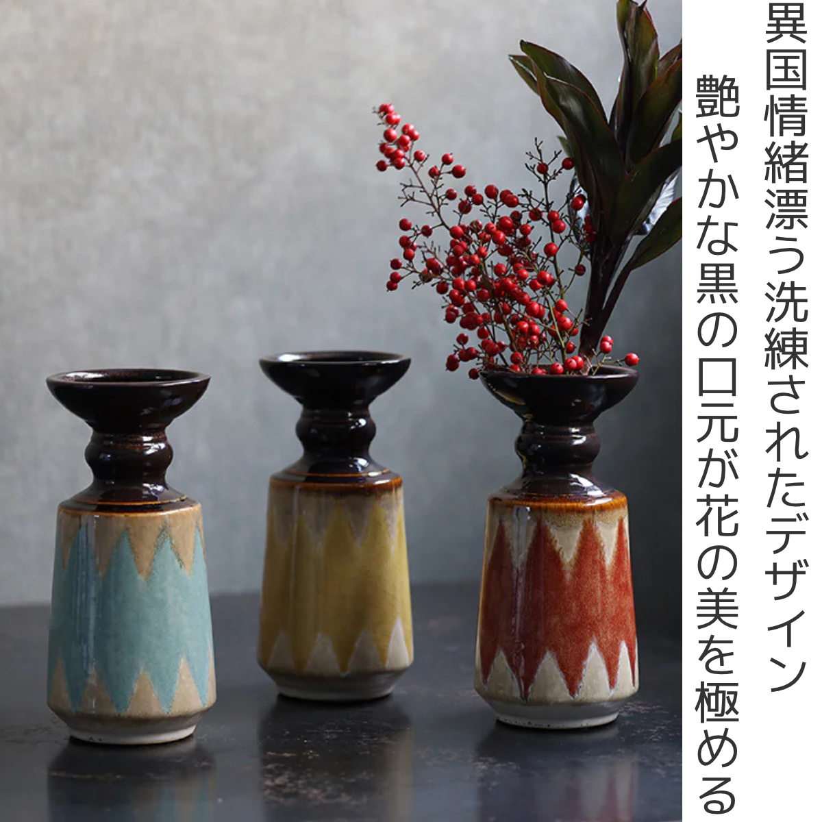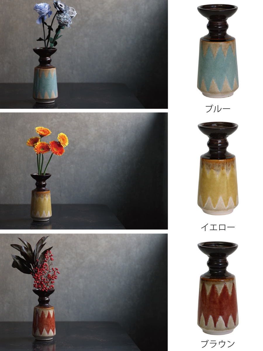艶やかな黒釉が口元を引き締め、落ち着いたカラーと異国情緒が共鳴する陶器製花器。ひとつ置くだけで、空間にアートのような存在感をもたらします。