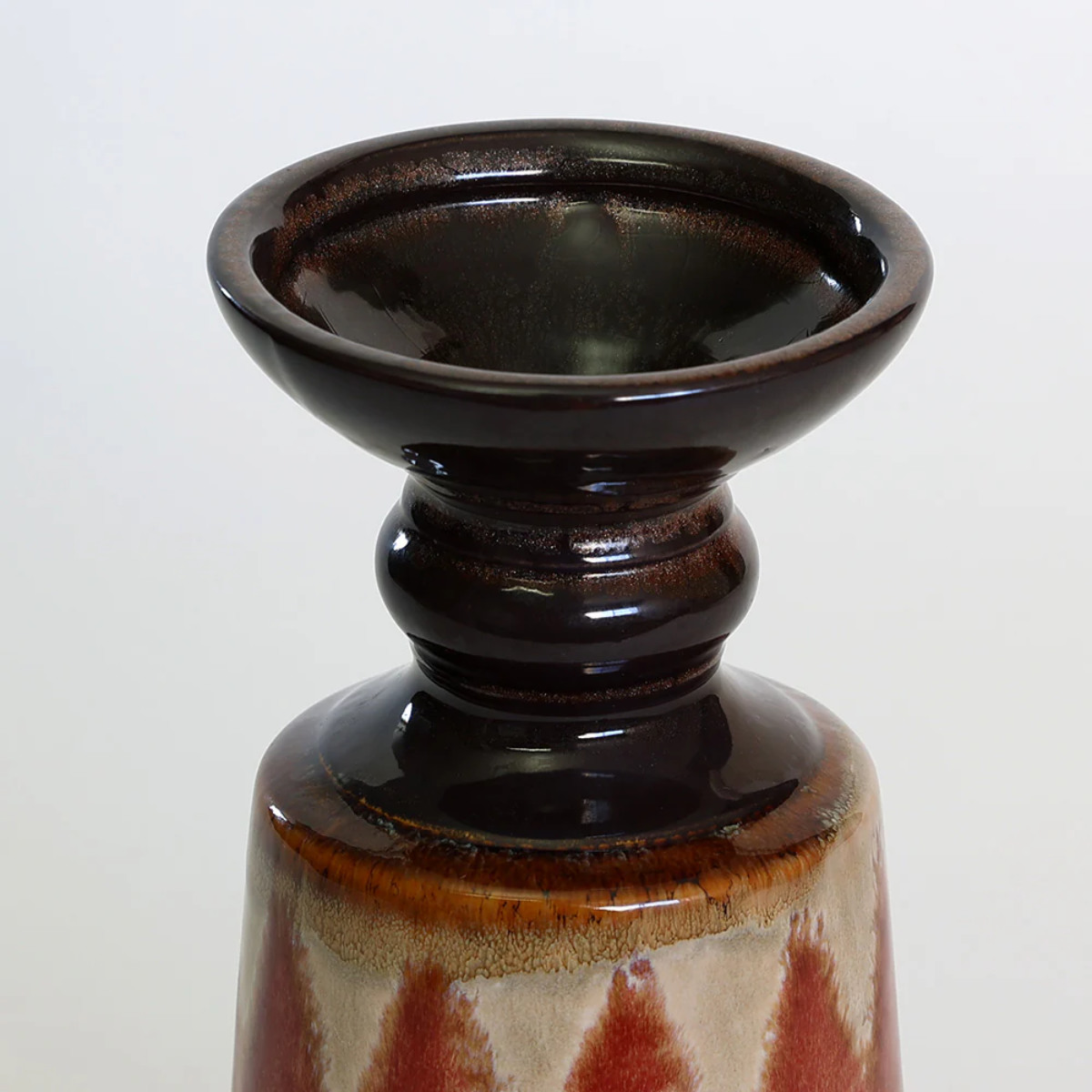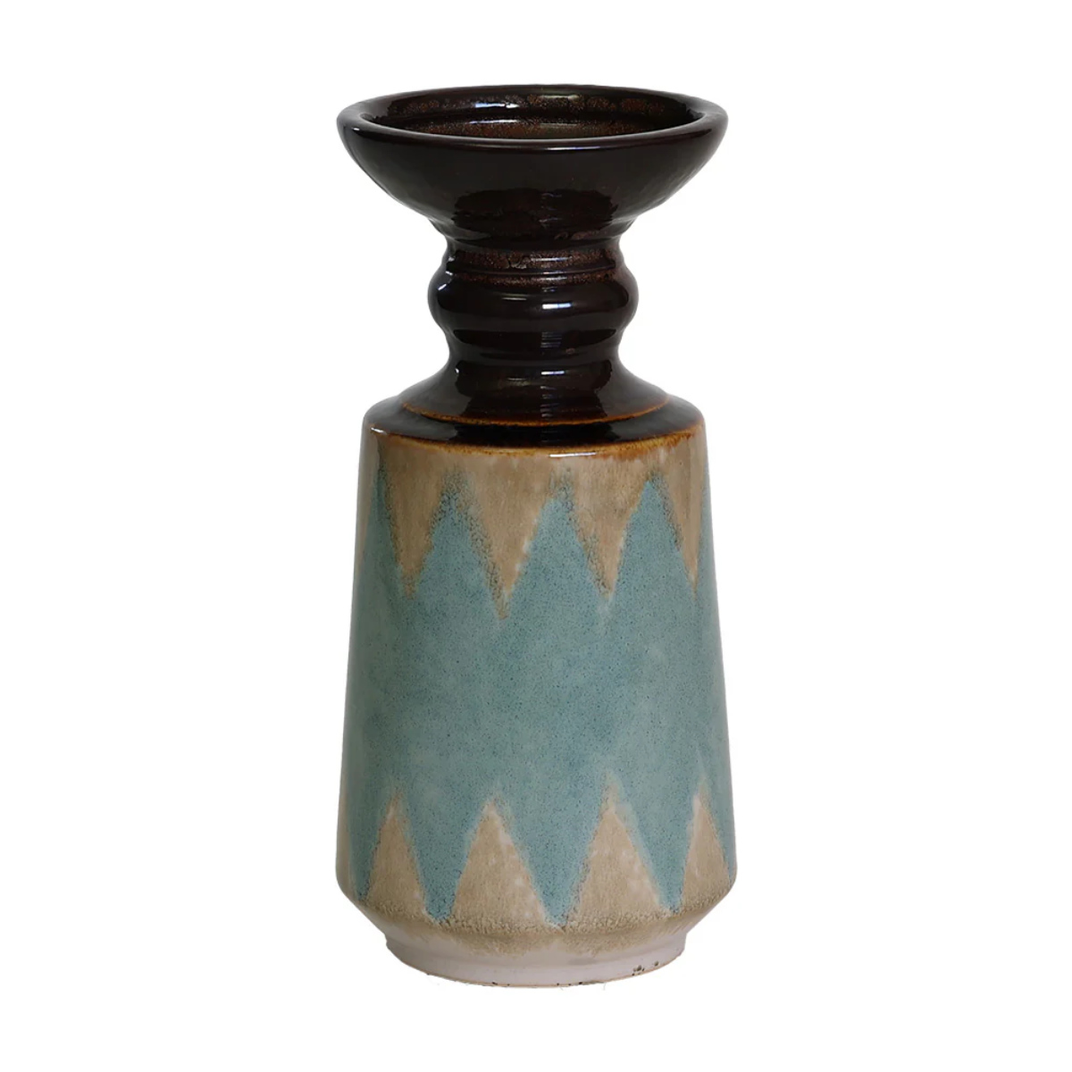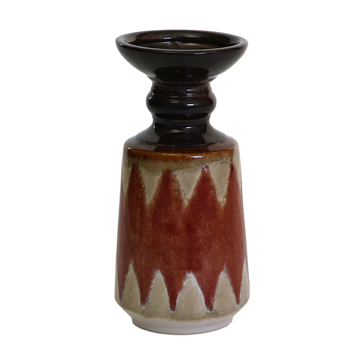 艶やかな黒釉が口元を引き締め、落ち着いたカラーと異国情緒が共鳴する陶器製花器。ひとつ置くだけで、空間にアートのような存在感をもたらします。
