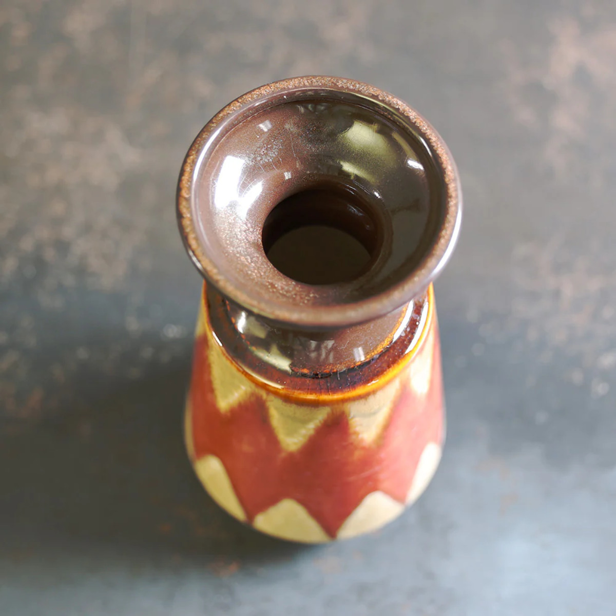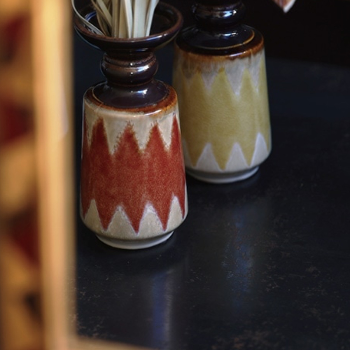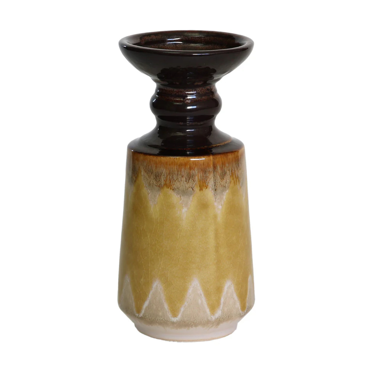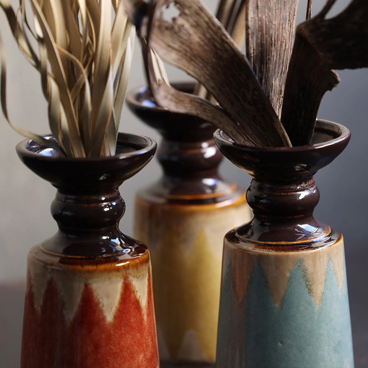 艶やかな黒釉が口元を引き締め、落ち着いたカラーと異国情緒が共鳴する陶器製花器。ひとつ置くだけで、空間にアートのような存在感をもたらします。