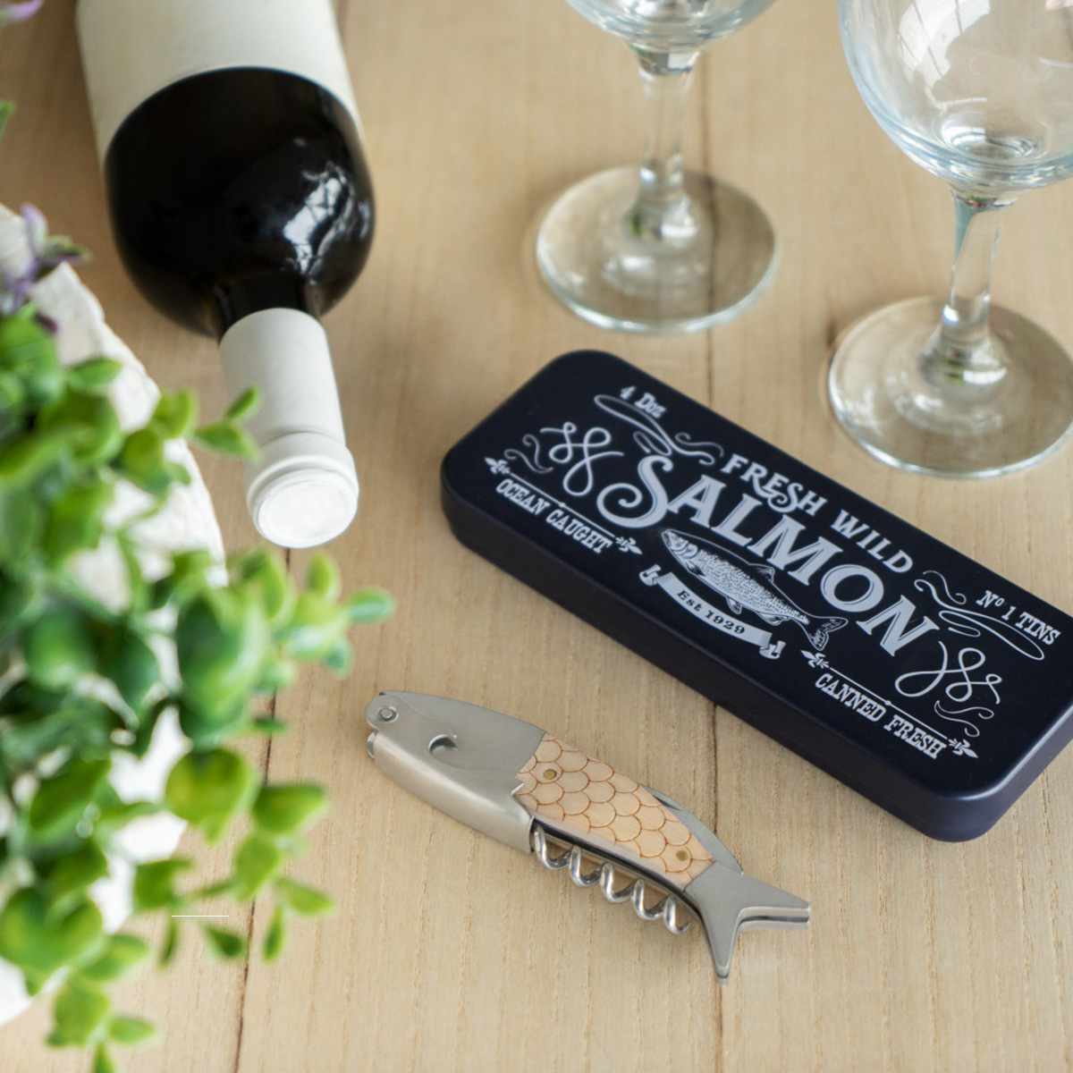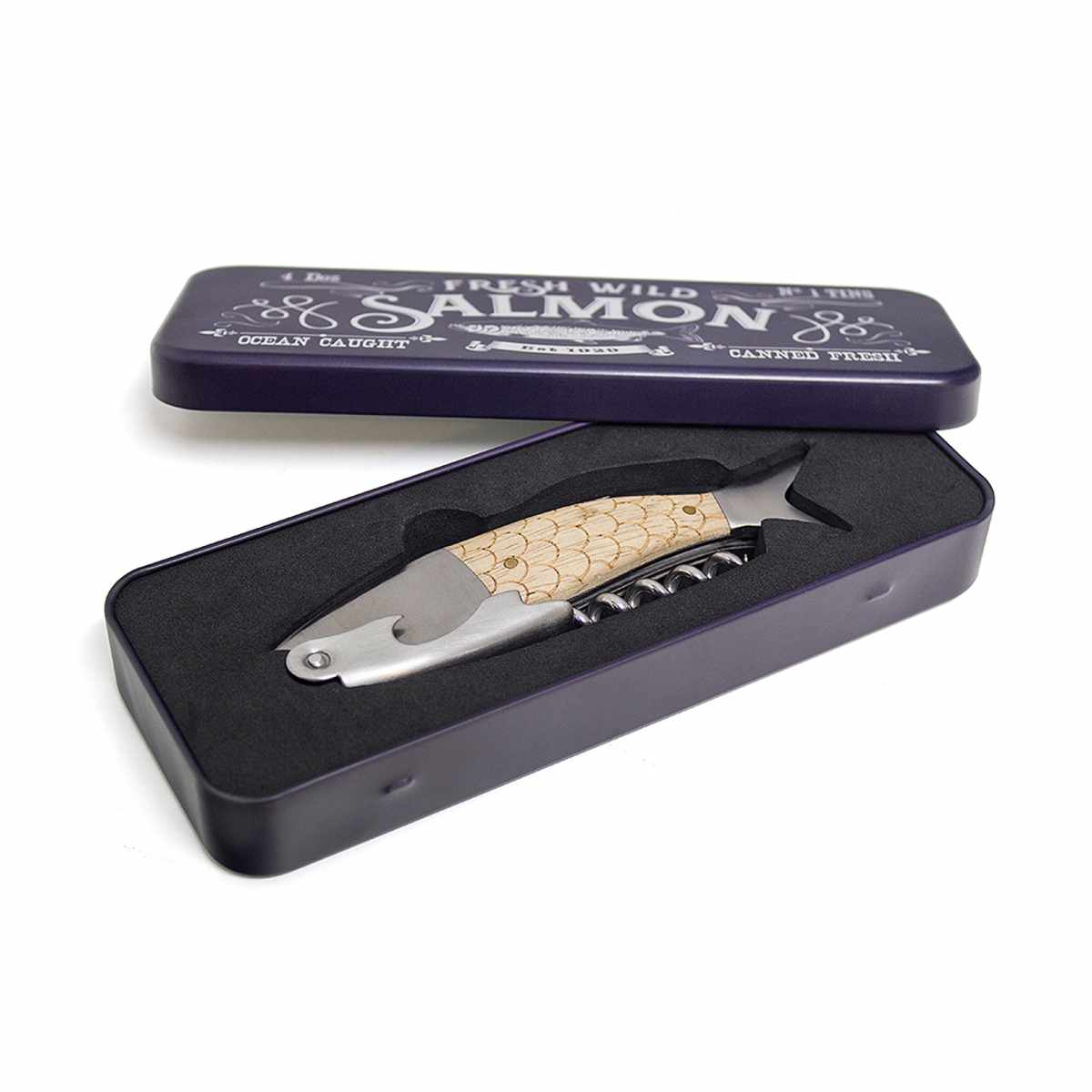 レトロなデザイン缶に入った魚モチーフのボトルオープナーです。コルクも王冠もこれひとつで開けられる、遊び心あふれる便利アイテムです。