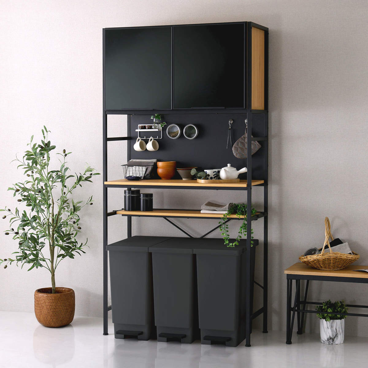生活感の出やすいものを、すっきり収めて空間が整うゴミ箱上ラックです。45Lのゴミ箱が3つ置けるゴミ箱上ラックに食器や家電をまとめて収納できます。収納力と機能性、そして意匠の美しさをひとつに。使いやすさと佇まいにより、キッチンに整った空気をもたらします。