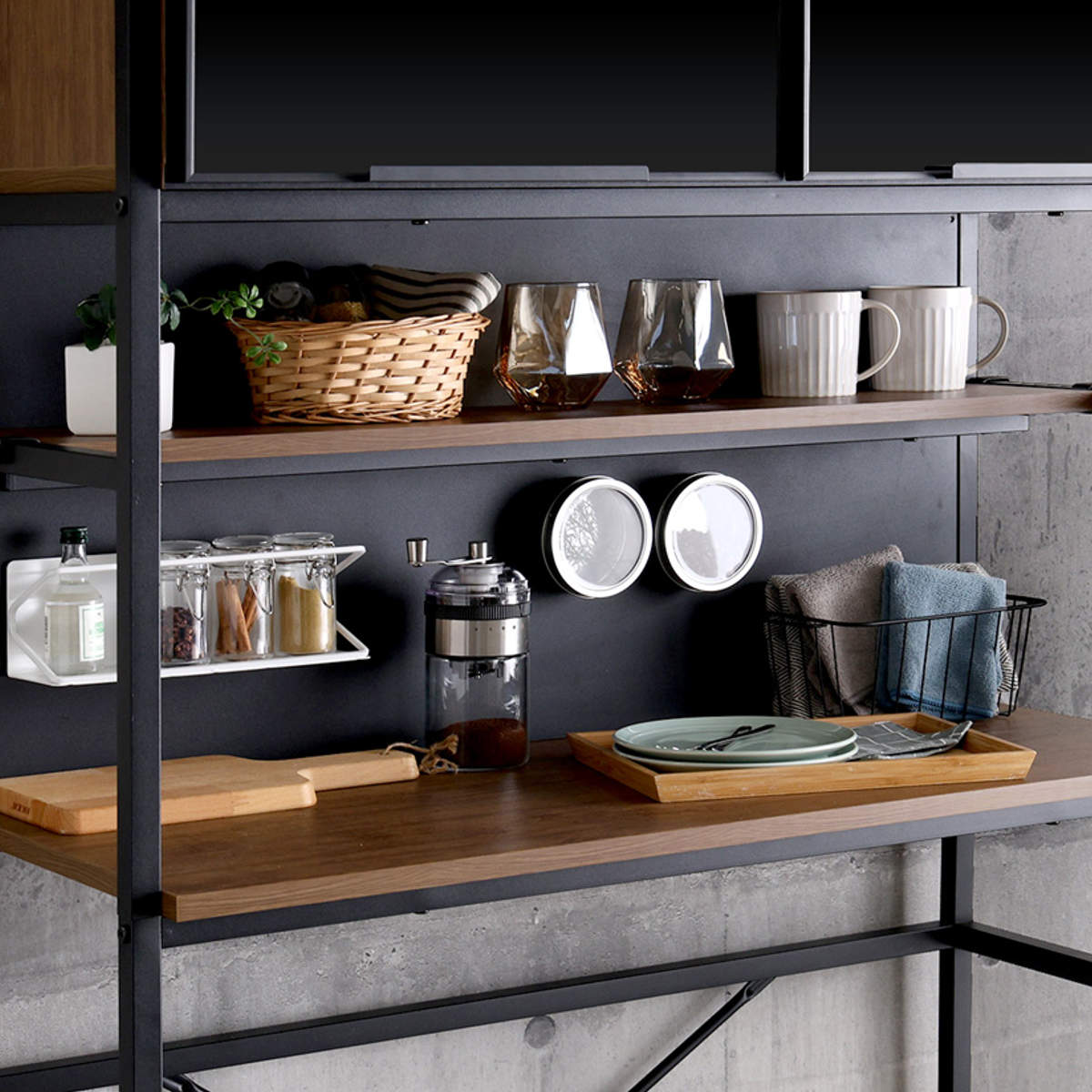 無駄のない設計で、キッチン小物をスマートに収納できます。ガラス扉、可動棚に加えて背面がマグネット対応になっています。