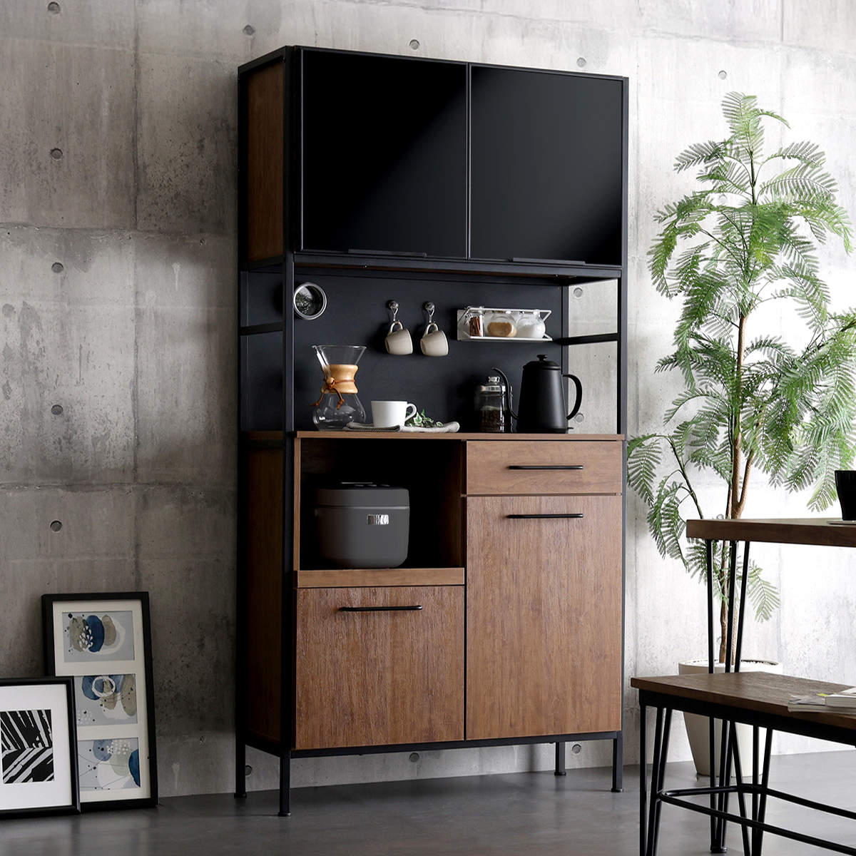 無駄のない設計で、キッチン小物をスマートに収納できます。ガラス扉、スライド棚、引き出し、開き扉に加えて背面がマグネット対応になっています。食器やキッチン家電、食品のストック類をまとめて収納できる機能的な食器棚です。