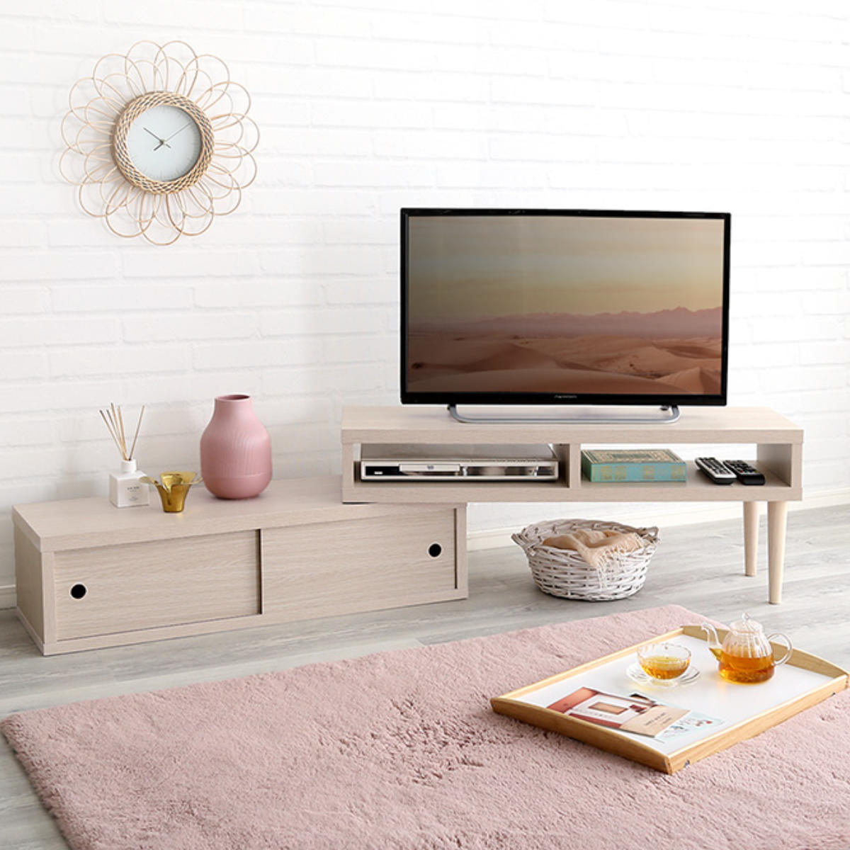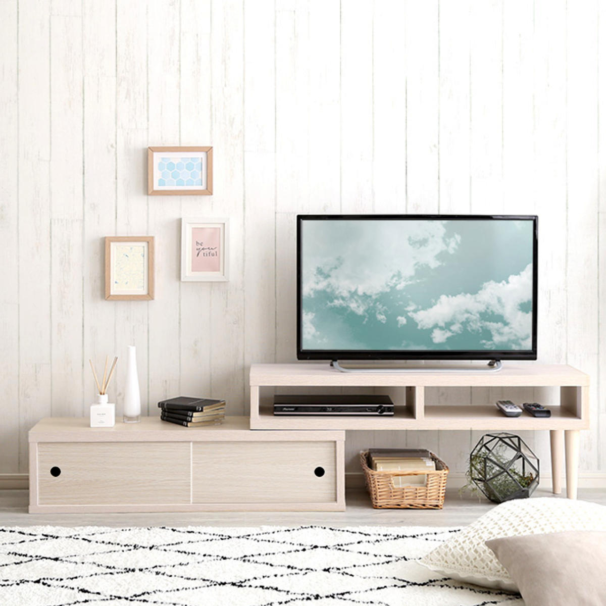 テレビやお部屋のサイズに合わせて、コンパクトにもワイドにも調整可能。最小約100cmの省スペース設計で、家具の配置替えや買い替え、引っ越しなどさまざまなシーンに柔軟に対応します。