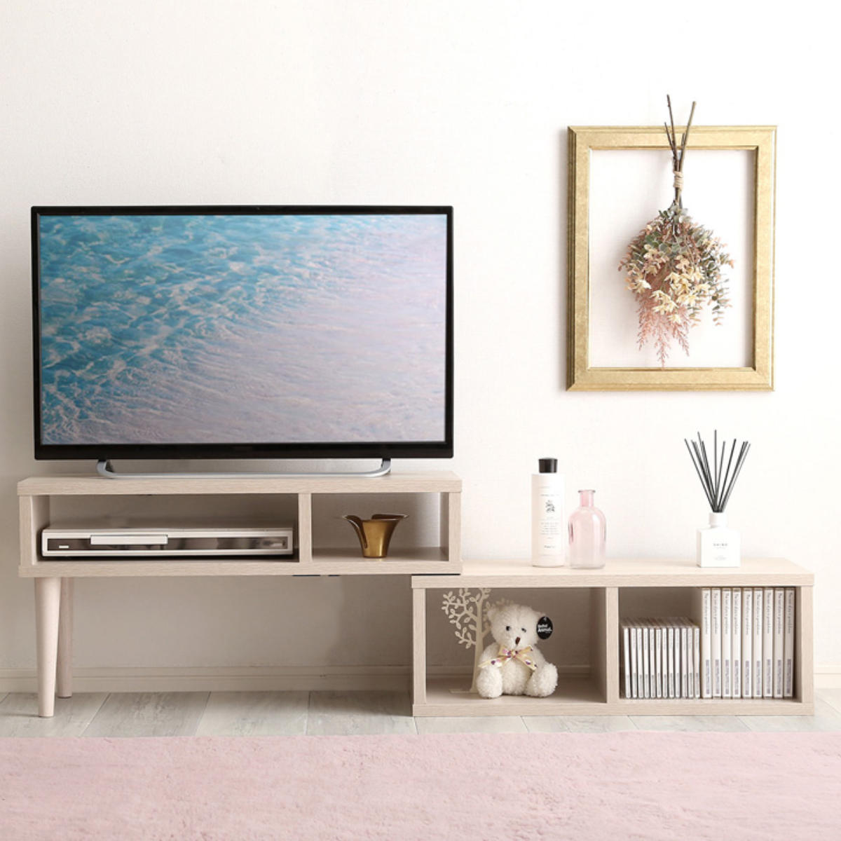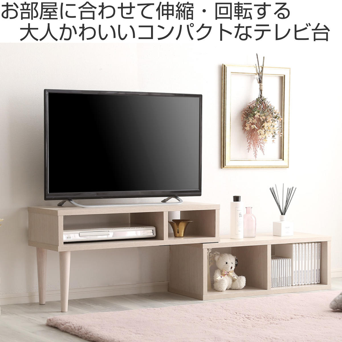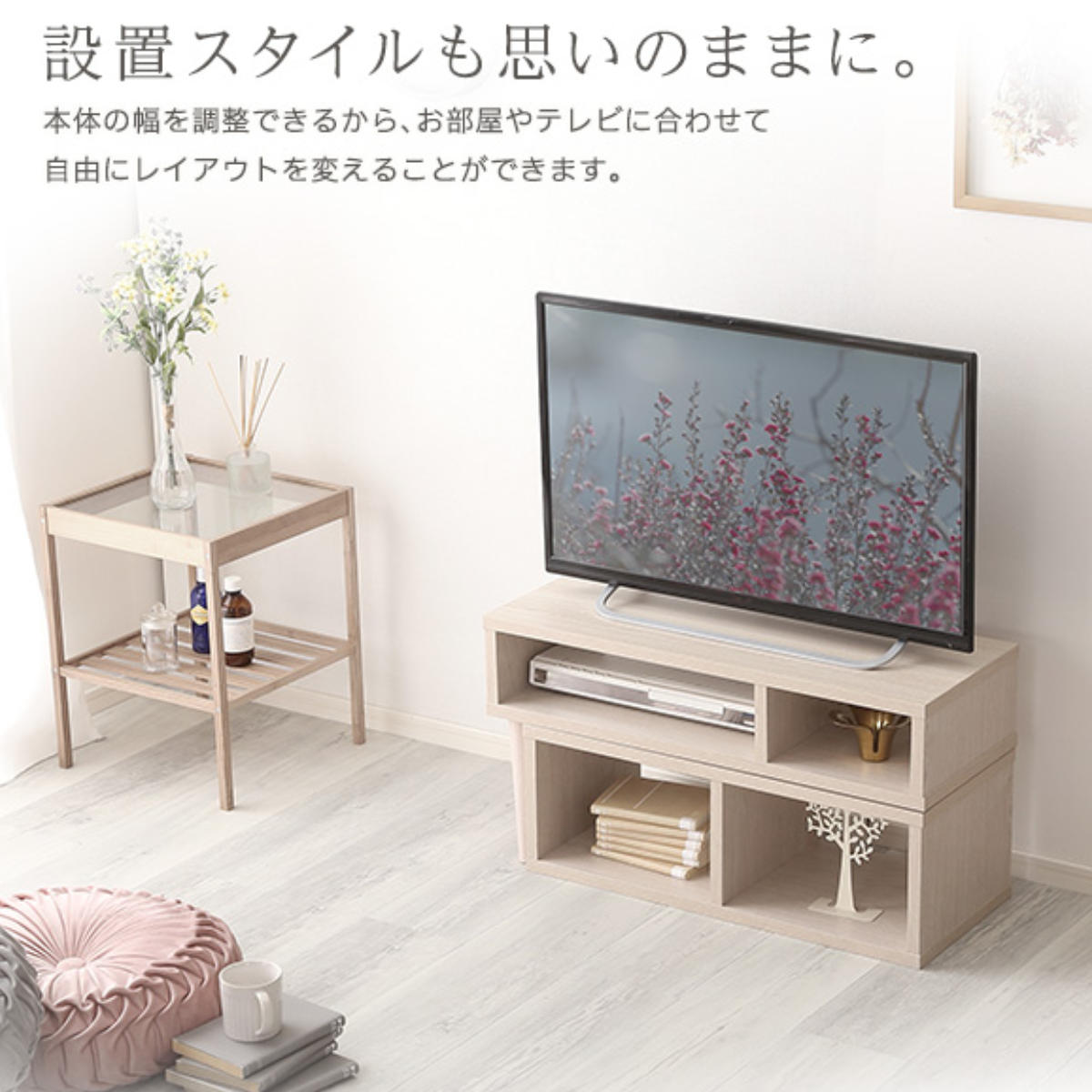 テレビやお部屋のサイズに合わせて、コンパクトにもワイドにも調整可能です。自由なレイアウトで、リビングにぴったりフィットします。