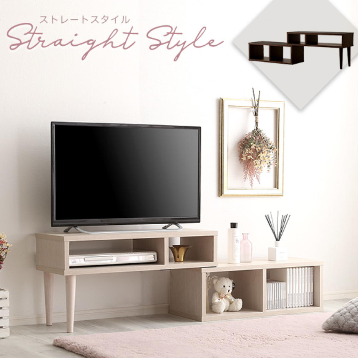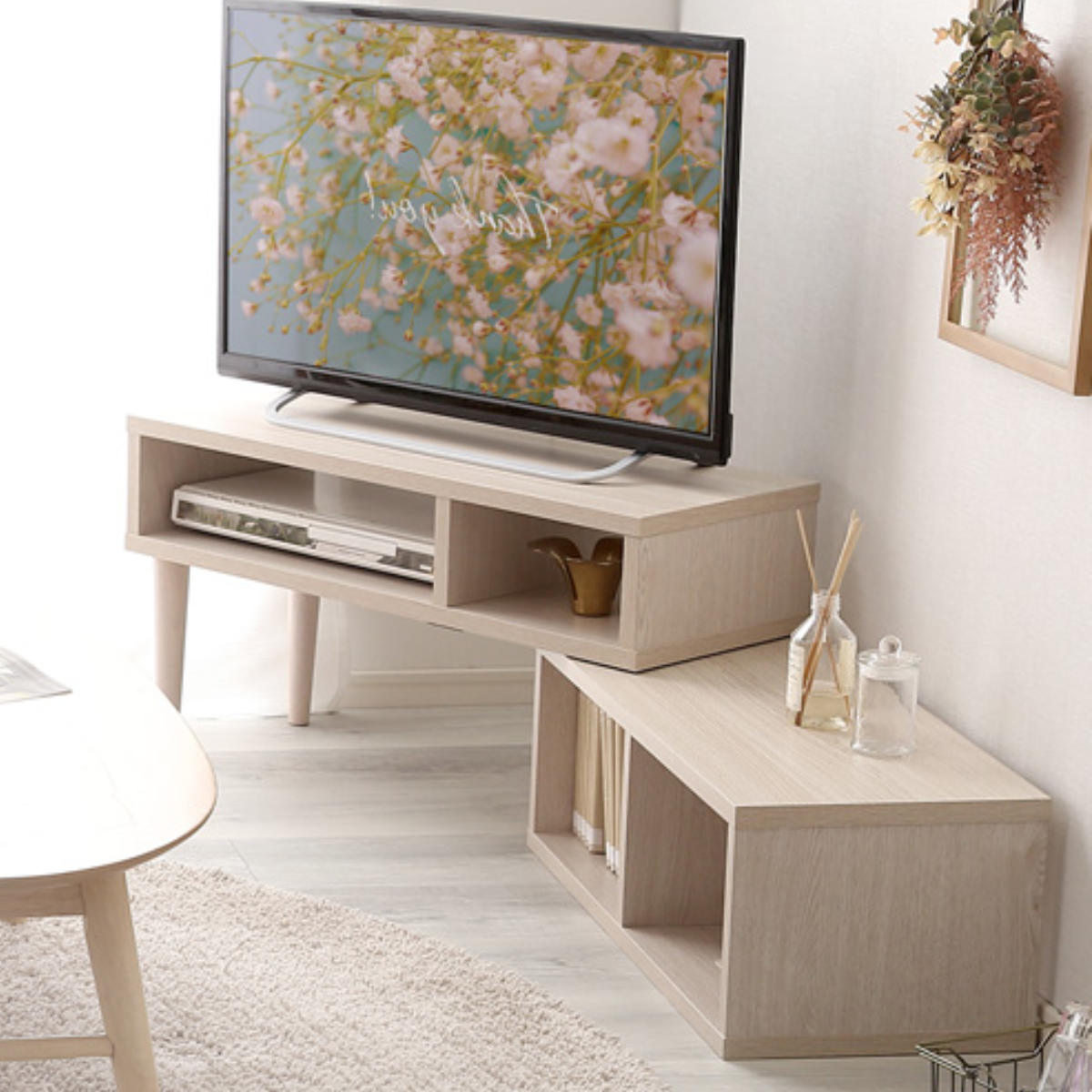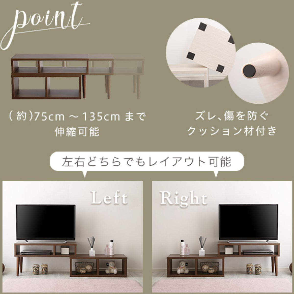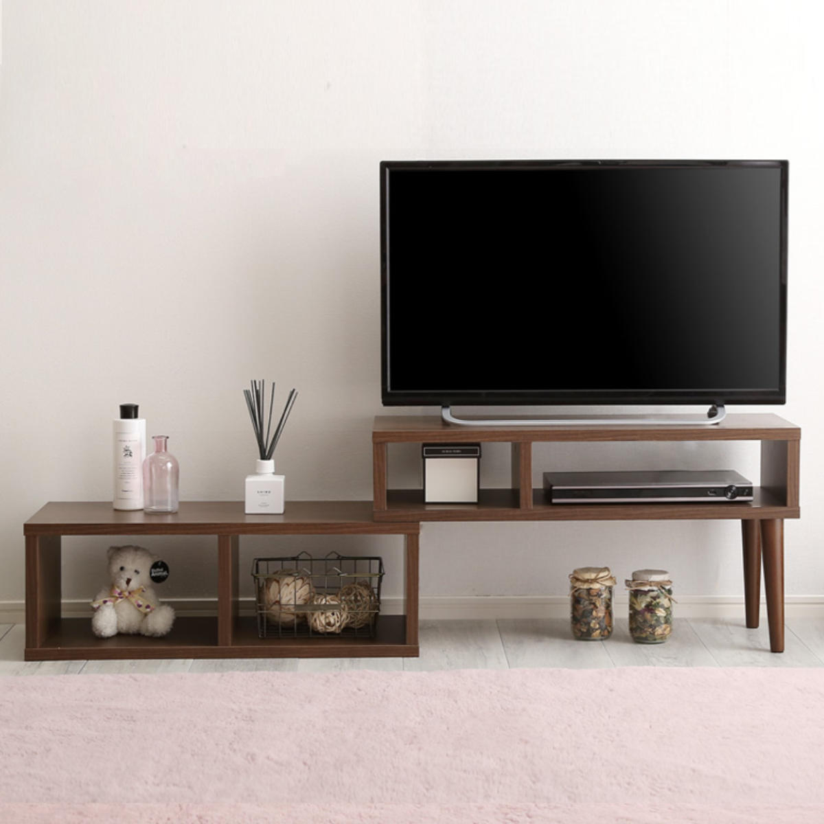 テレビやお部屋のサイズに合わせて、コンパクトにもワイドにも調整可能です。自由なレイアウトで、リビングにぴったりフィットします。