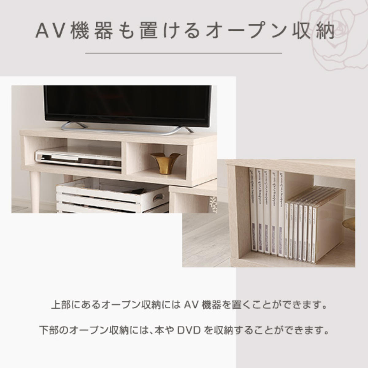 上段のテレビ下スペースにはハードディスクやAV機器をすっきり収納できます。オープン棚なので機器の操作や配線も簡単です。