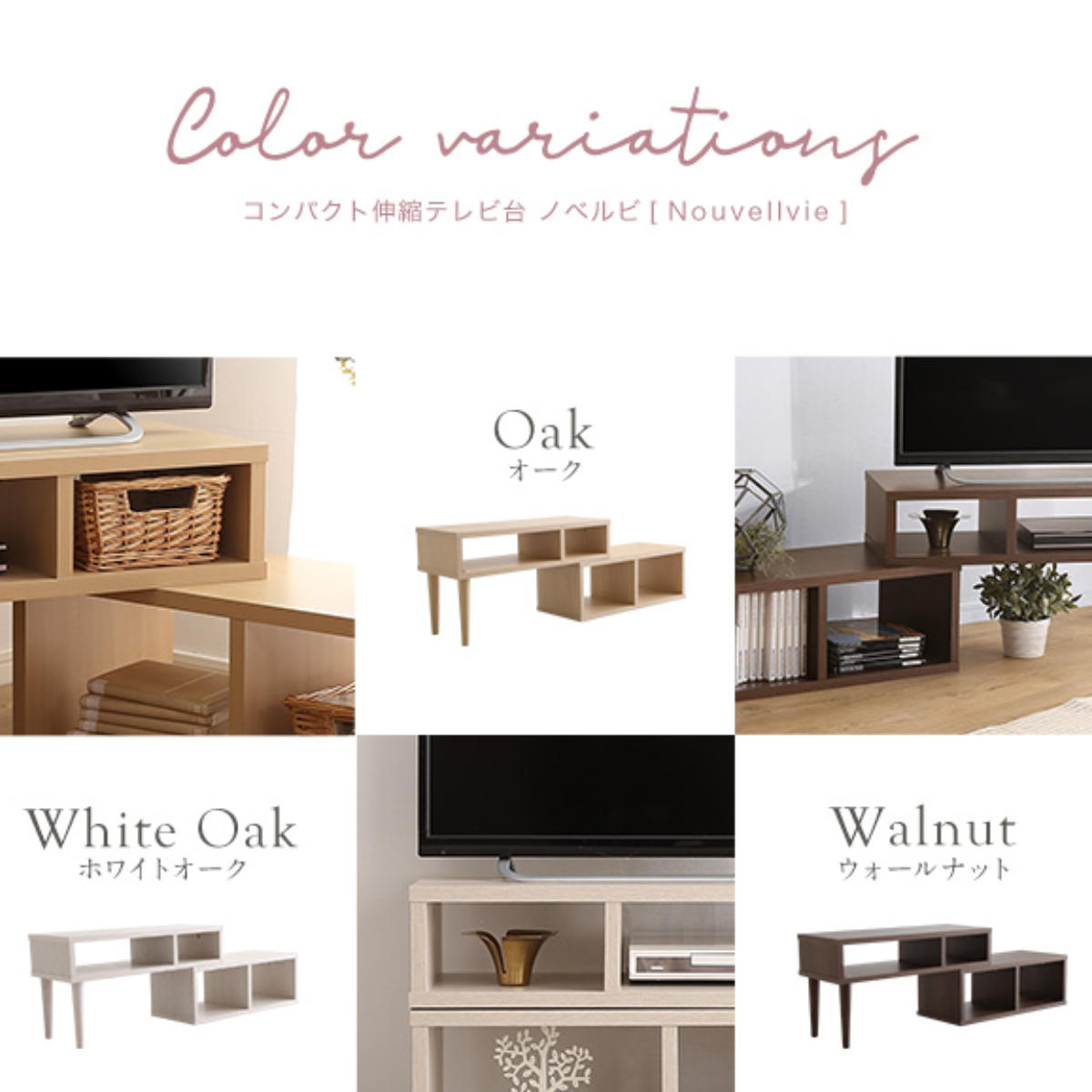 シンプルで大人かわいい木目調のテレビ台「Nouvellvie(ノベルビ)」です。コンパクトながら、上段は下段に載せるだけで、幅や角度を変えたり、左右を入れ替えたり、曲げたり重ねたりと自由にアレンジ可能です。