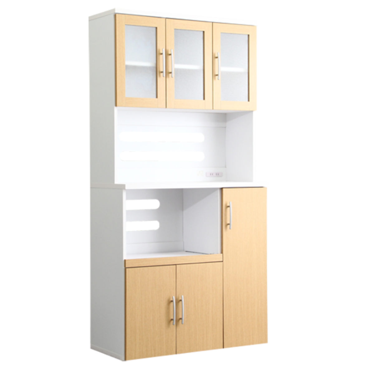 食器棚 幅90cm 2口コンセント付き スライド棚 可動棚 収納 ツートーン ( カップボード キッチンラック コンセント付 食器収納 レンジボード レンジ台 ガラス扉 家電収納 ダークブラウン ナチュラル ホワイト ) 【ナチュラル】