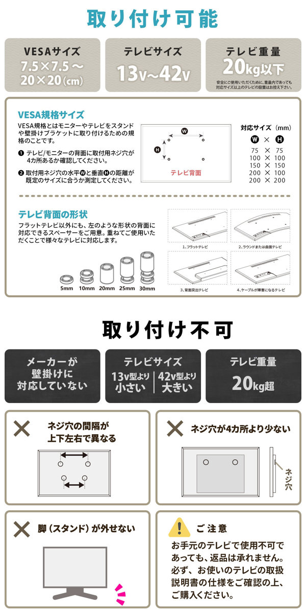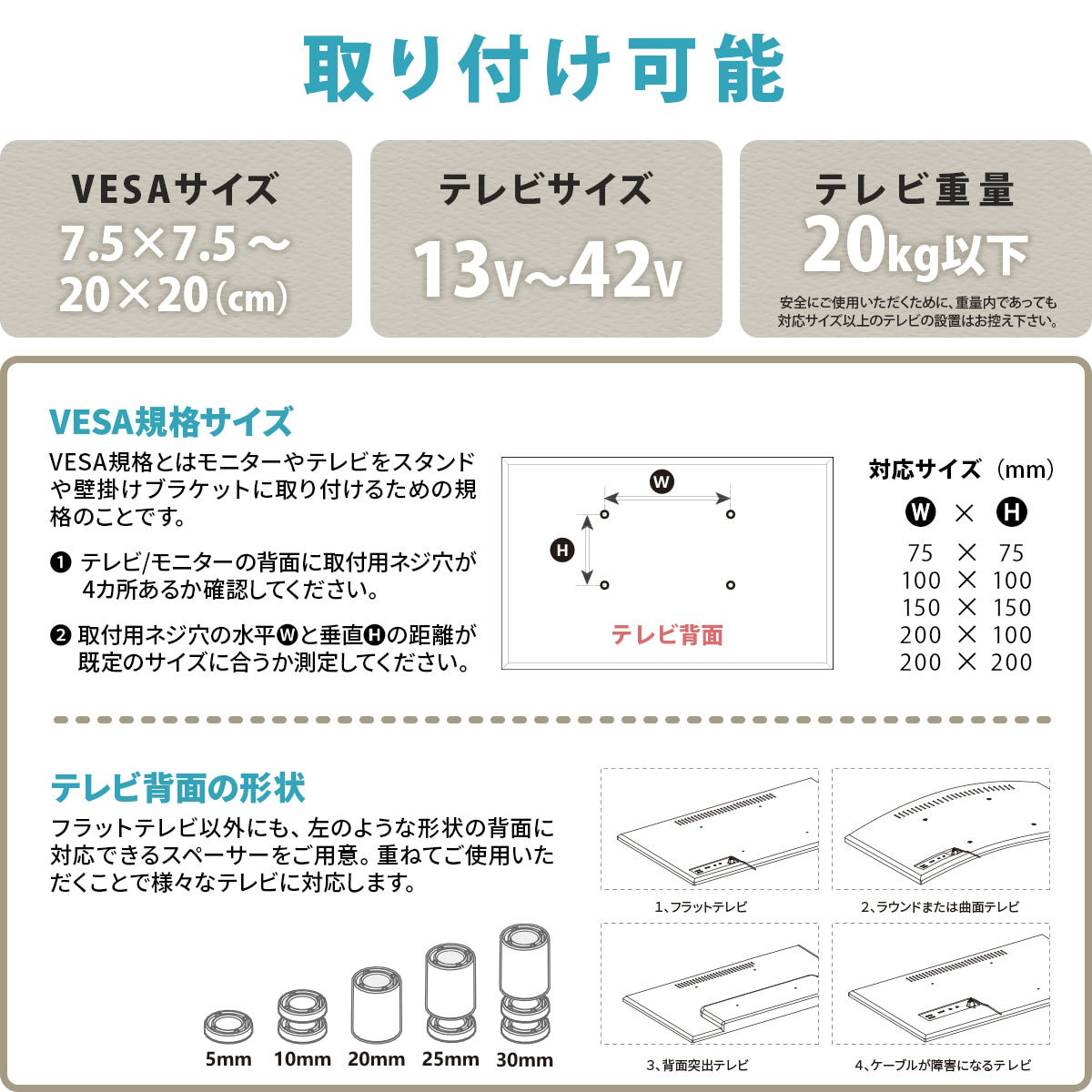 | 対応サイズ | 【対応VESA】 7.5×7.5cm~20×20cm |