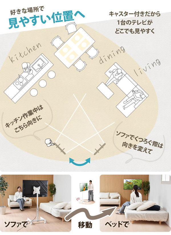 リビングやダイニング、キッチンで料理中でもキャスター付きだから、見やすい位置へ移動が簡単。1台のテレビがあれば、おうちのどこにいても見やすく快適に過ごせます。