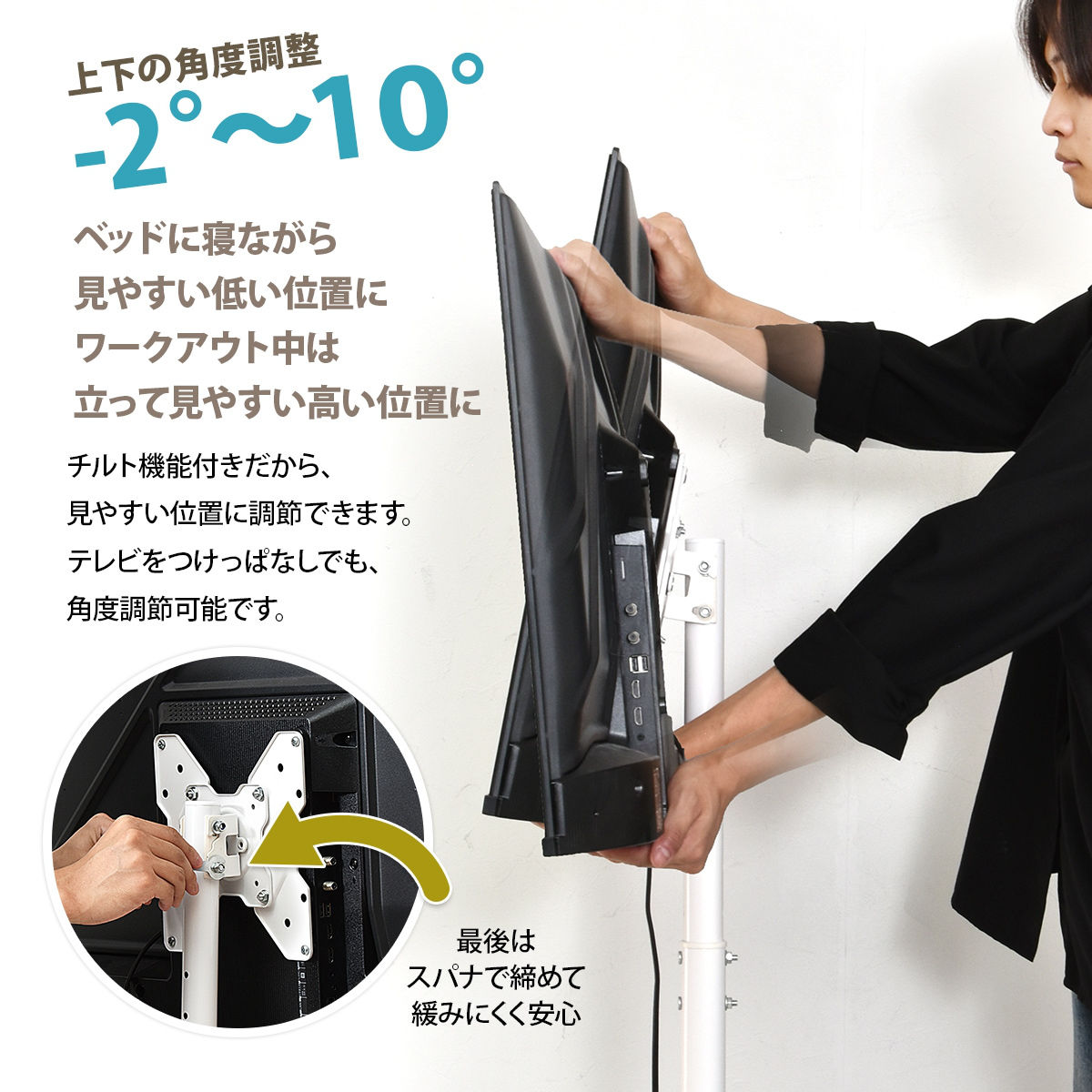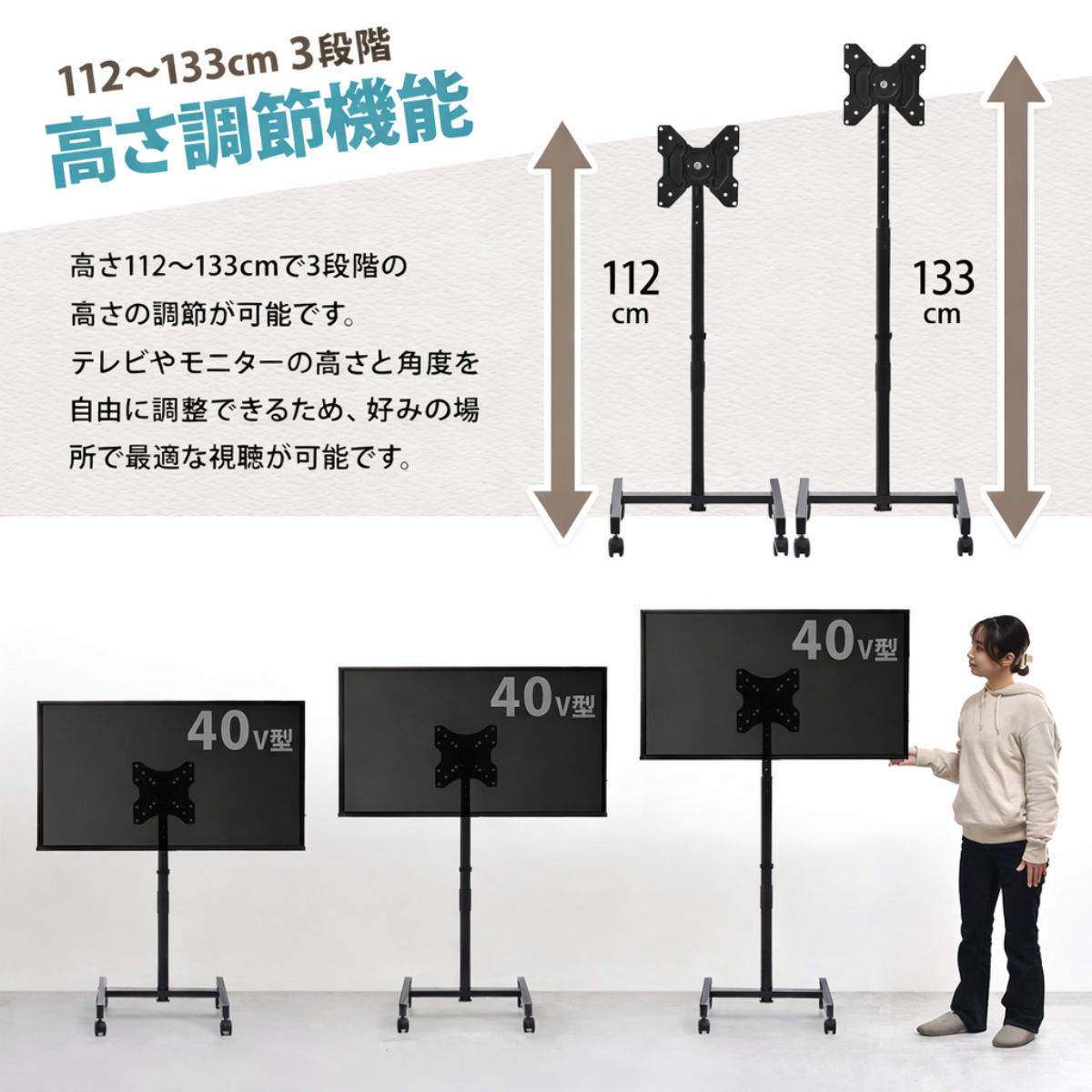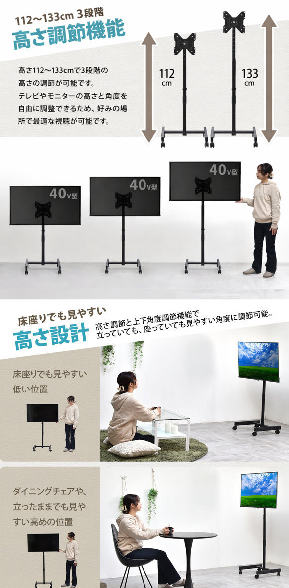 112~133cmの3段階調節に対応しており、床に座っての視聴から、リビングチェアに座った状態、立ったままでも見やすい高さに設定できます。