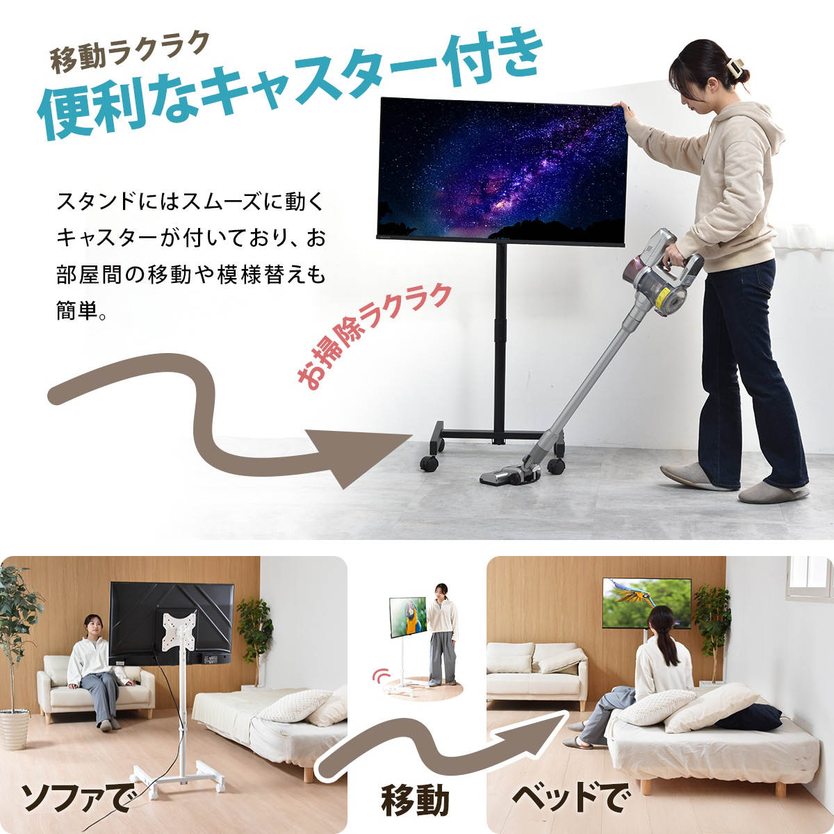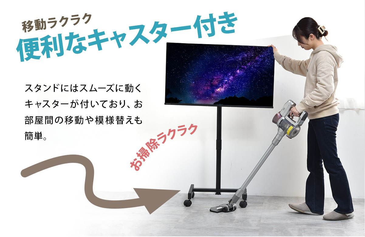 スタンドはスムーズに動くキャスター付きなのでお部屋間の移動や模様替えも簡単です。大きなテレビ台を動かして掃除する手間も省けるので、お部屋の清潔も保てます。