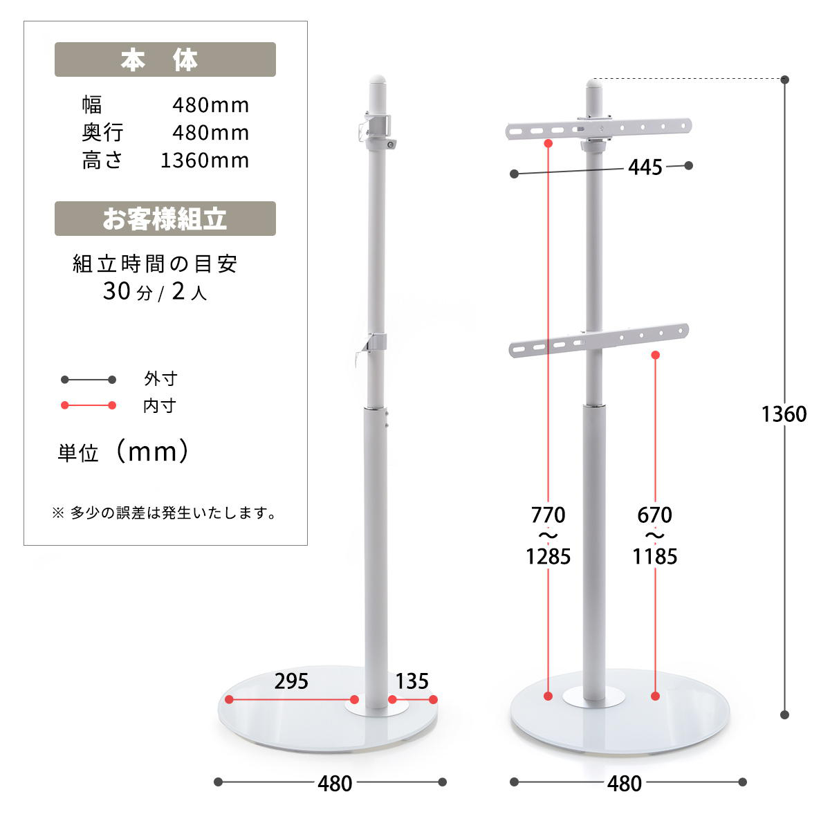 | サイズ | 約 幅48×奥行48×高さ136(cm) 伸縮可動域:90~129.5(cm) |