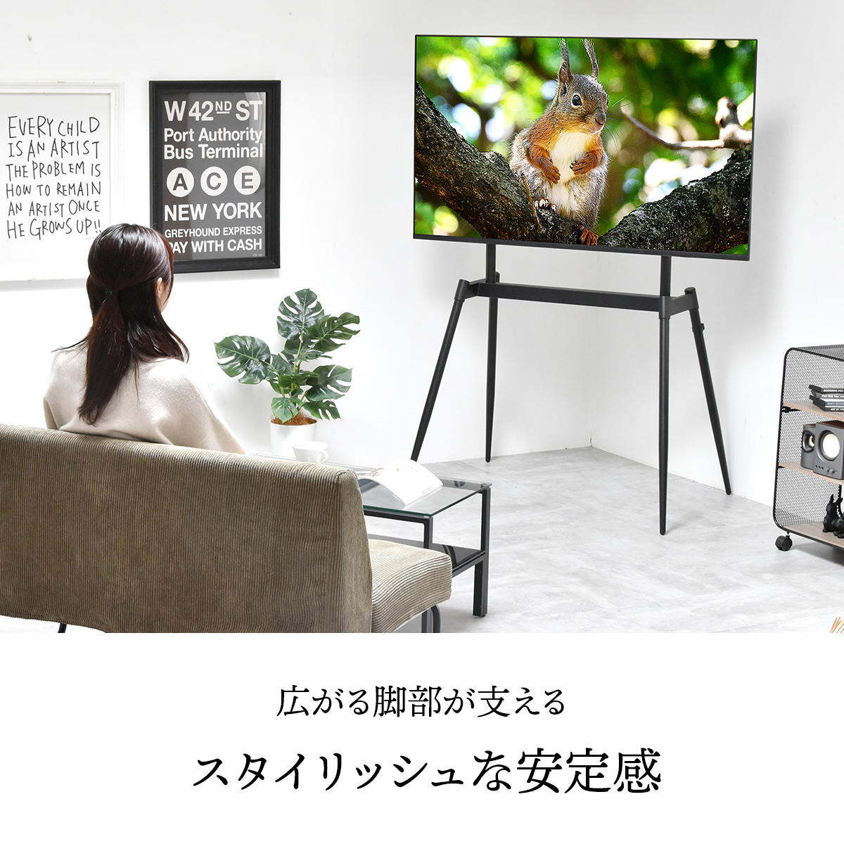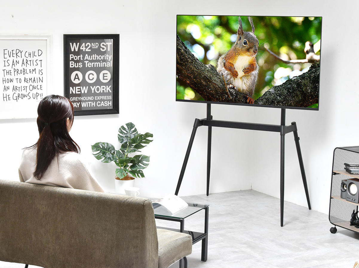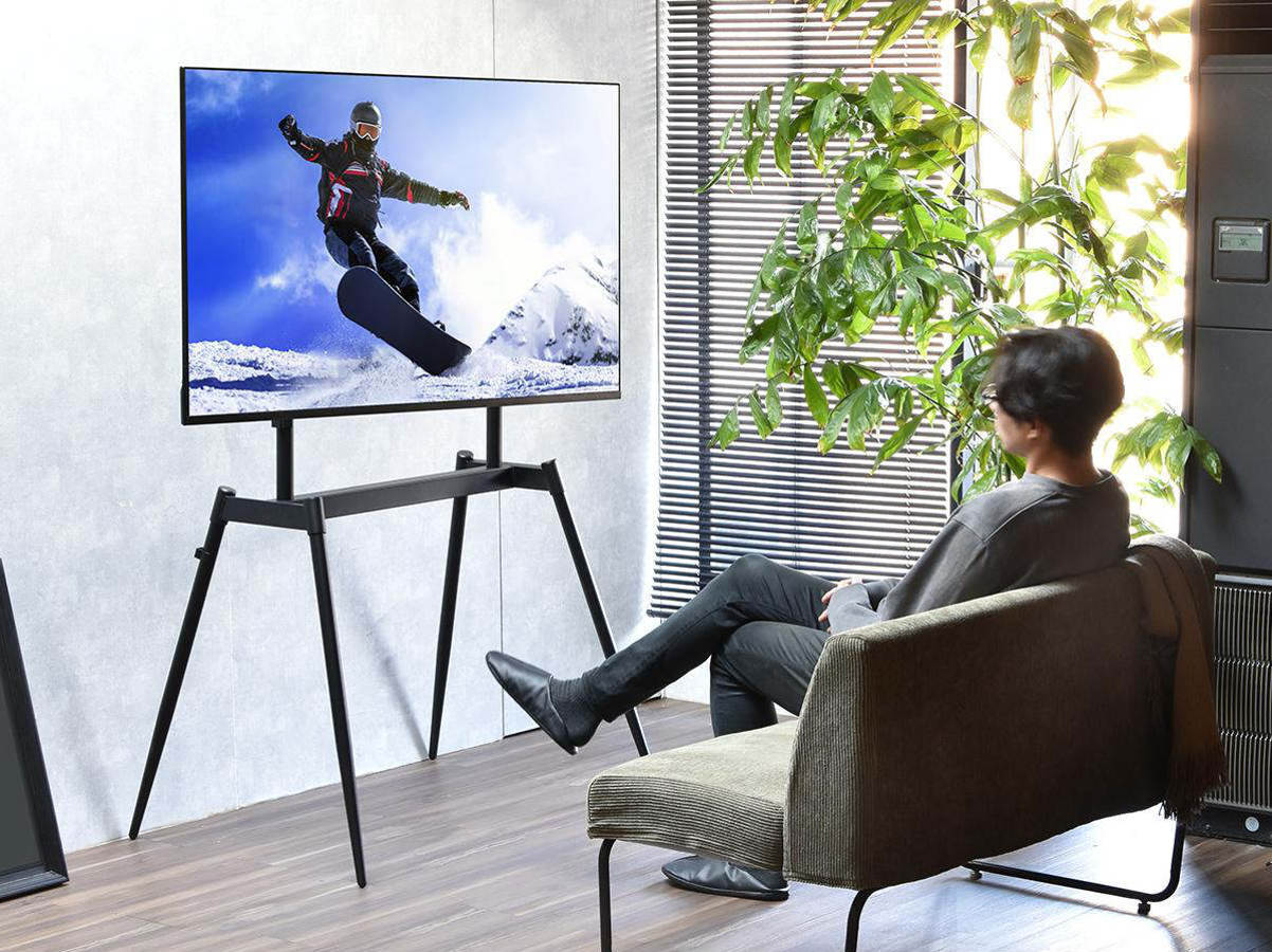 絵画のようにテレビが飾れるイーゼル型のテレビスタンドです。テレビをインテリアの一部として楽しむことができます。壁に穴をあけずに設置できるため、賃貸住宅にお住いの方にもおすすめです。