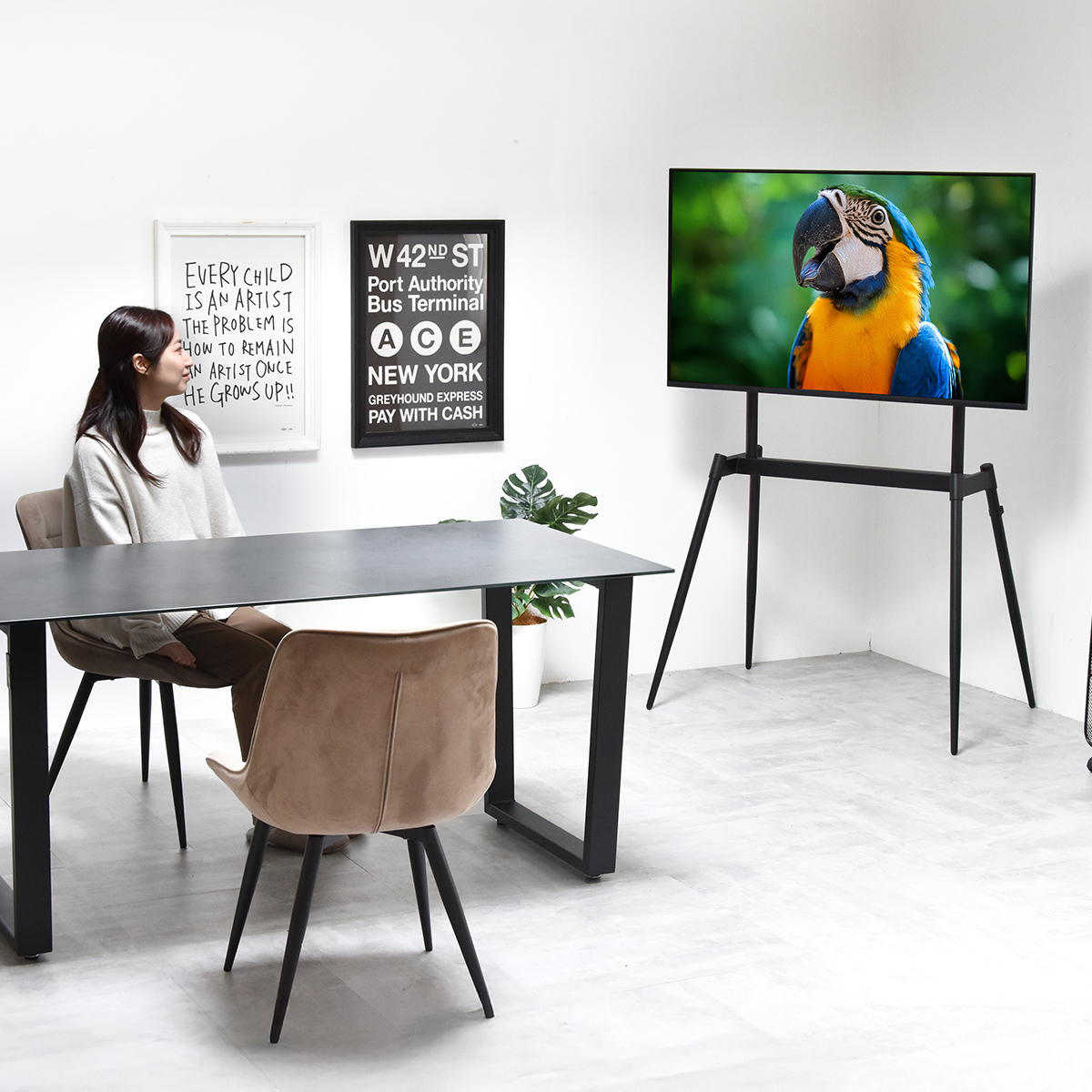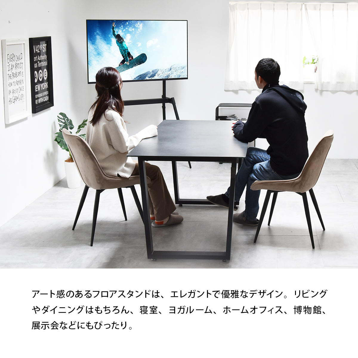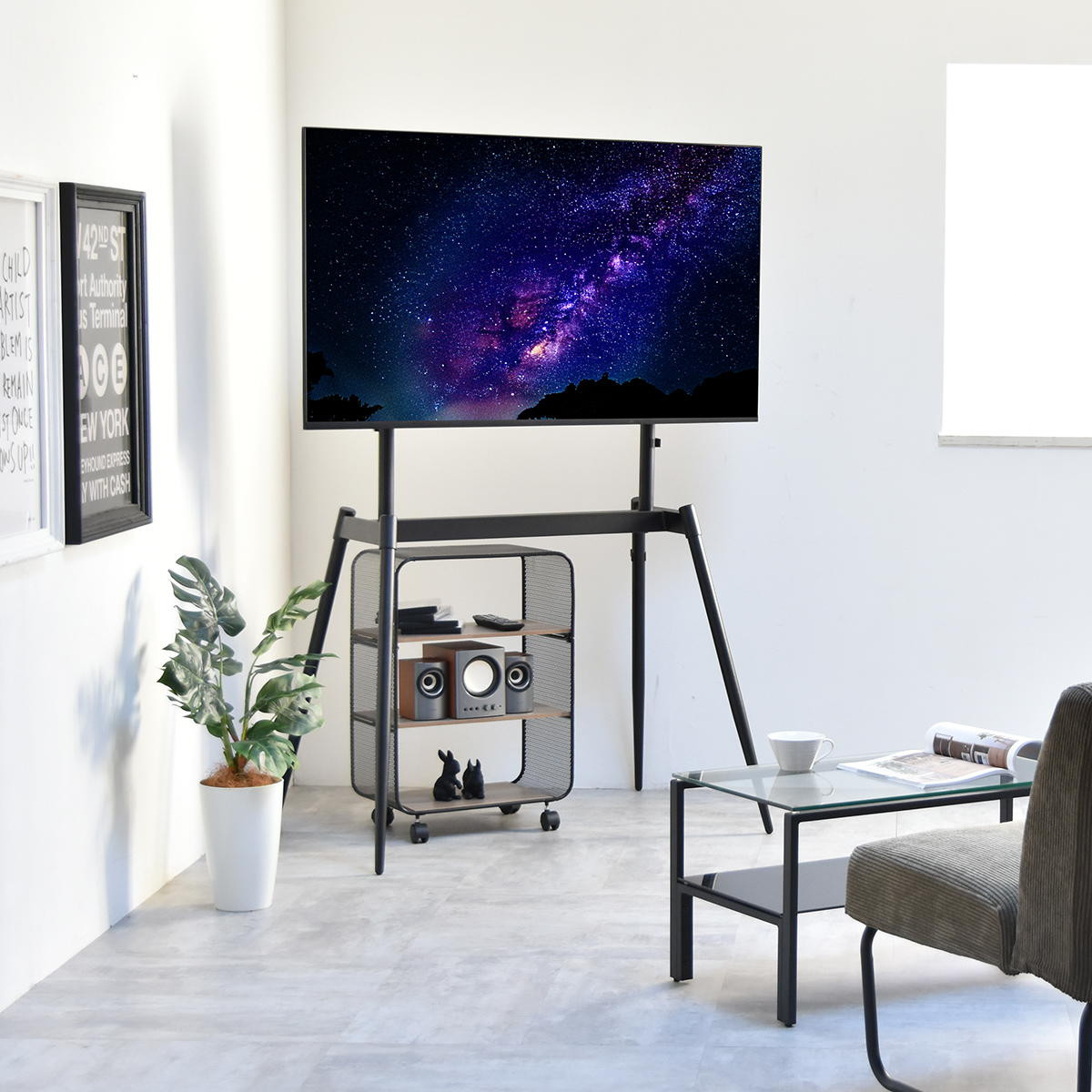 絵画のようにテレビが飾れるイーゼル型のテレビスタンドです。テレビをインテリアの一部として楽しむことができます。壁に穴をあけずに設置できるため、賃貸住宅にお住いの方にもおすすめです。