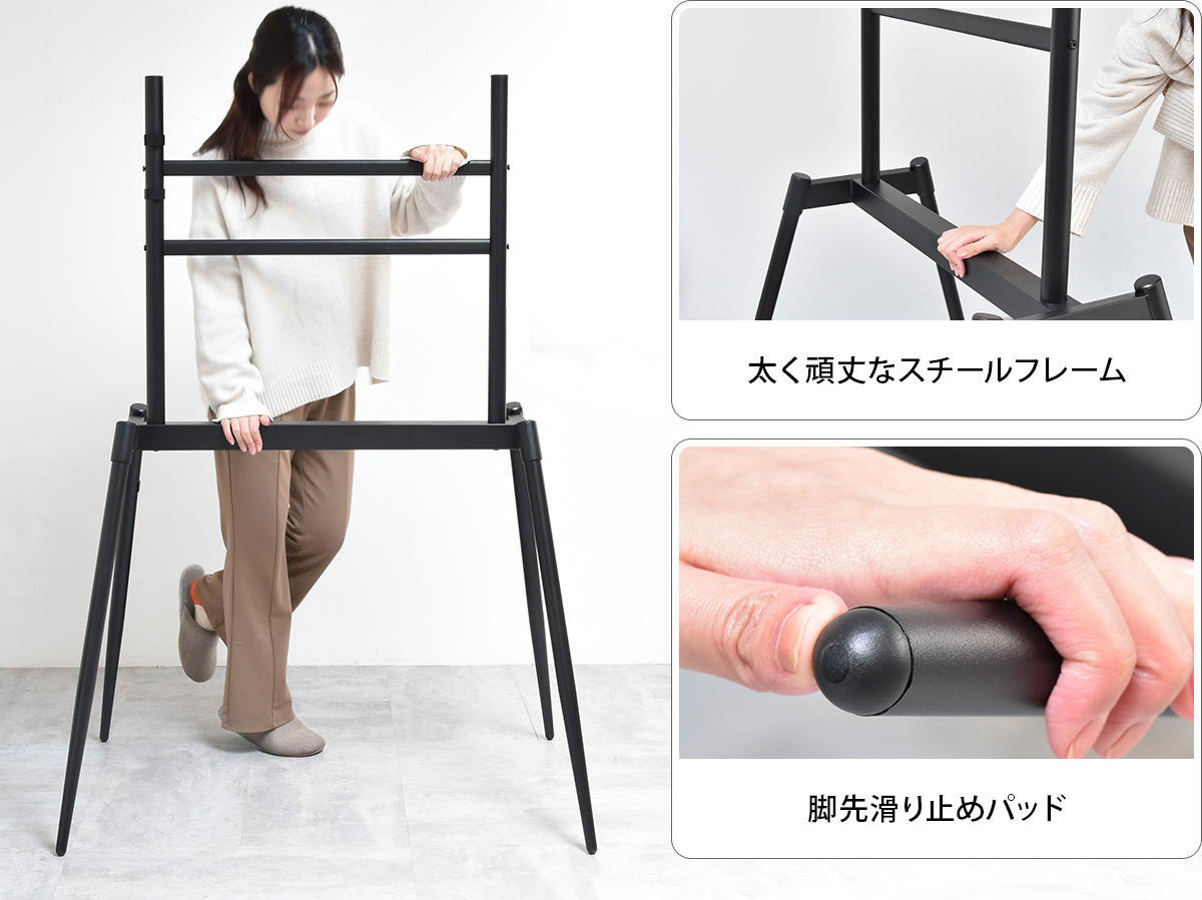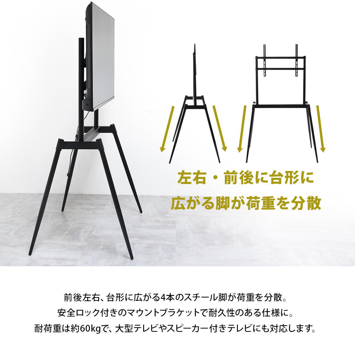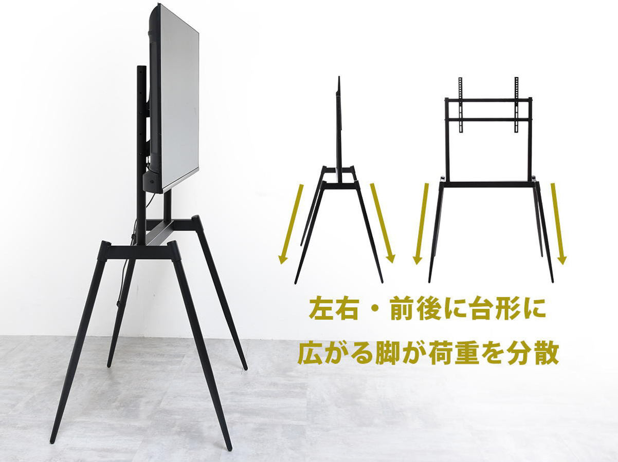前後左右、台形に広がる4本のスチール脚が荷重を分散しているので、しっかりとした安定感のある構造です。耐荷重が60kgなので、75V型の大型テレビやスピーカー付きのテレビにも対応できます。