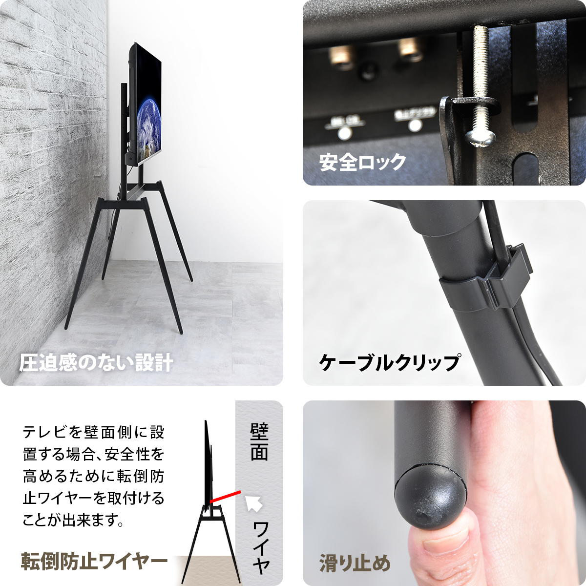 テレビスタンド Ease 75インチ対応 高さ139~154cm 壁寄せ ( テレビ台 スタンド 高さ調節 3段階 イーゼル型 転倒防止ワイヤー付 ブラック )