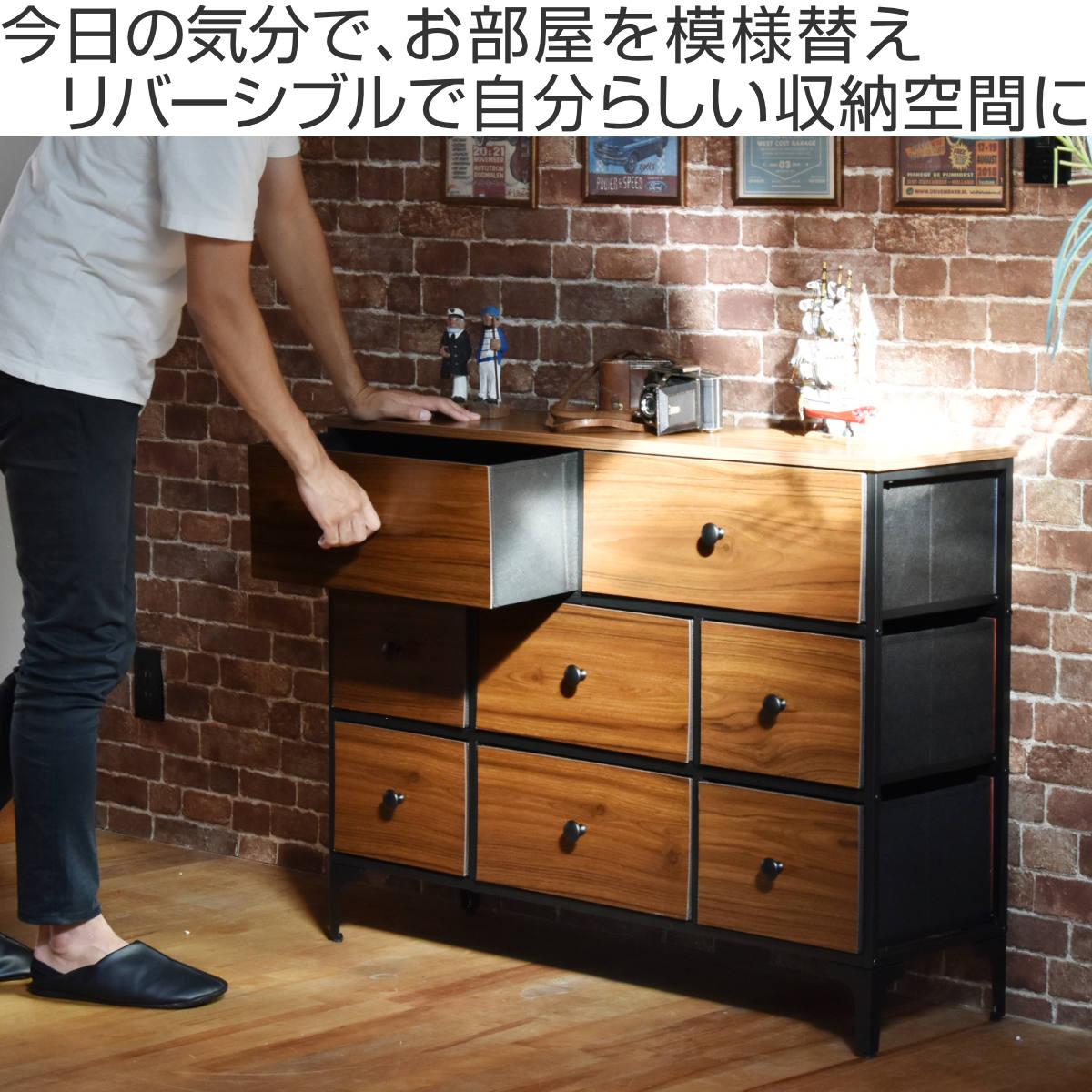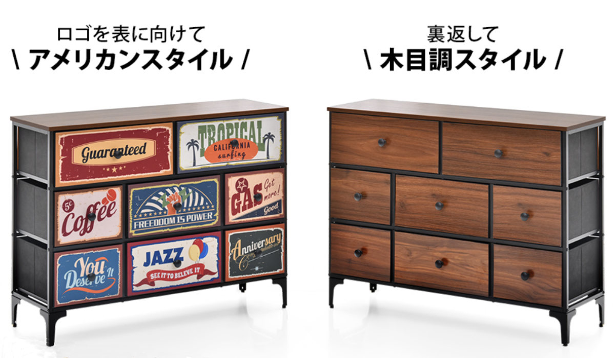 レトロなロゴをあしらった遊び心あるデザインと、リアルな木の手触りを感じるウッド調のフロントパネル。気分やお部屋の雰囲気に合わせて前板を裏返すだけで、ガラッと印象をチェンジできるチェストです。