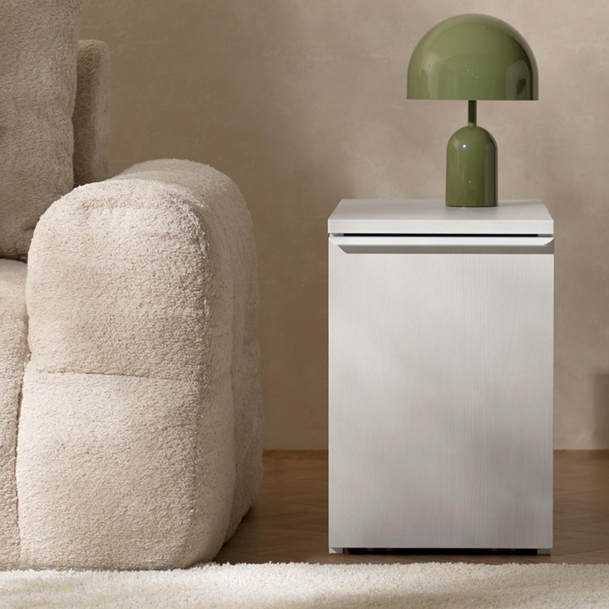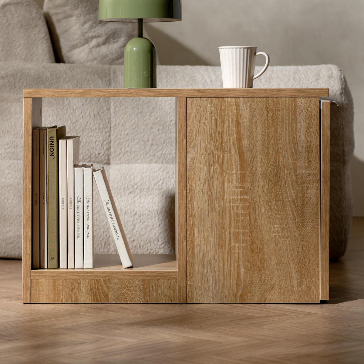 ソファ横でくつろぐ時間をより快適にする、ダストボックス付きサイドテーブル。マグカップやリモコンを置ける天板、雑誌や本をしまえる棚、サッと使えるゴミ箱が一体化。暮らしに寄り添う便利さと、空間に自然に馴染むデザインを両立しています。
