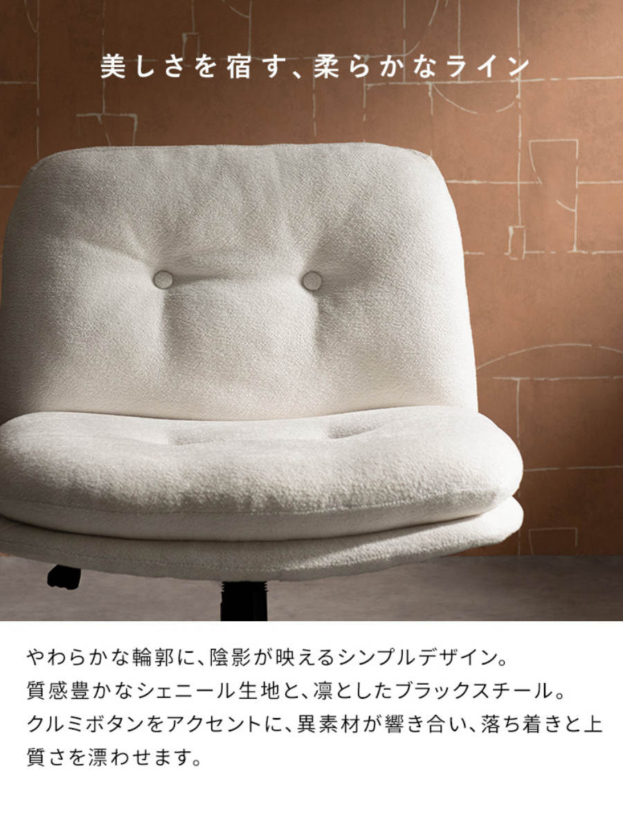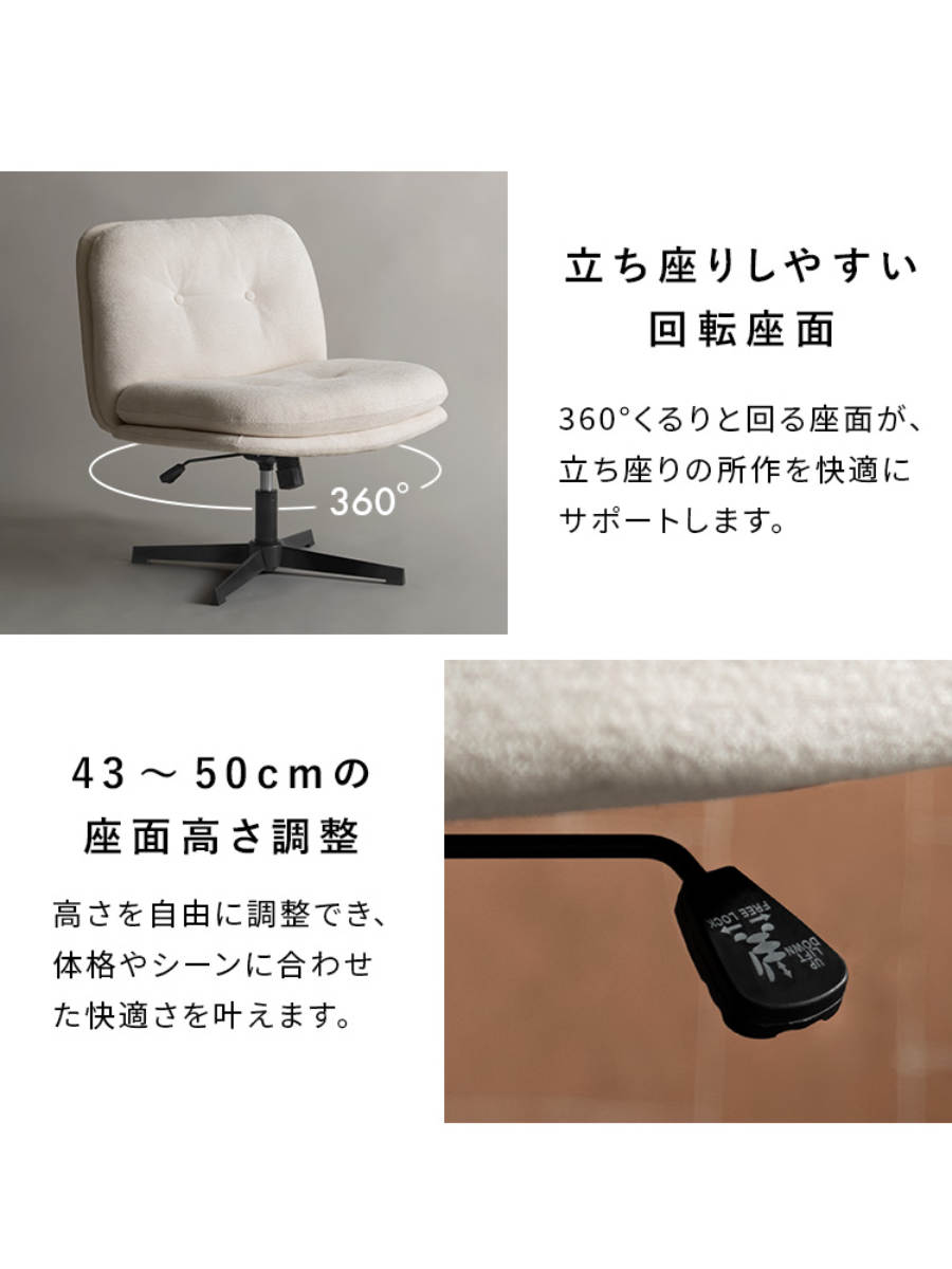 座面がスムーズに回転し、立ち座りも簡単。作業や読書、くつろぎなど、シーンを選ばず快適に使えます。