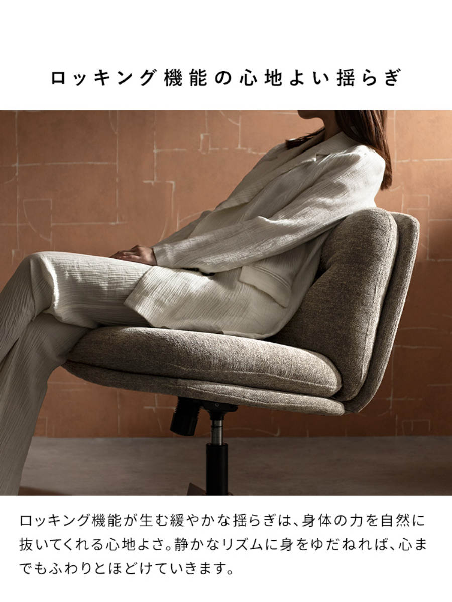 ロッキング機能が生み出す穏やかな揺らぎが、心と身体の緊張をやさしく解きほぐします。奥行きのある座面としっかりとしたクッションが、長時間でも快適な座り心地を叶えます。