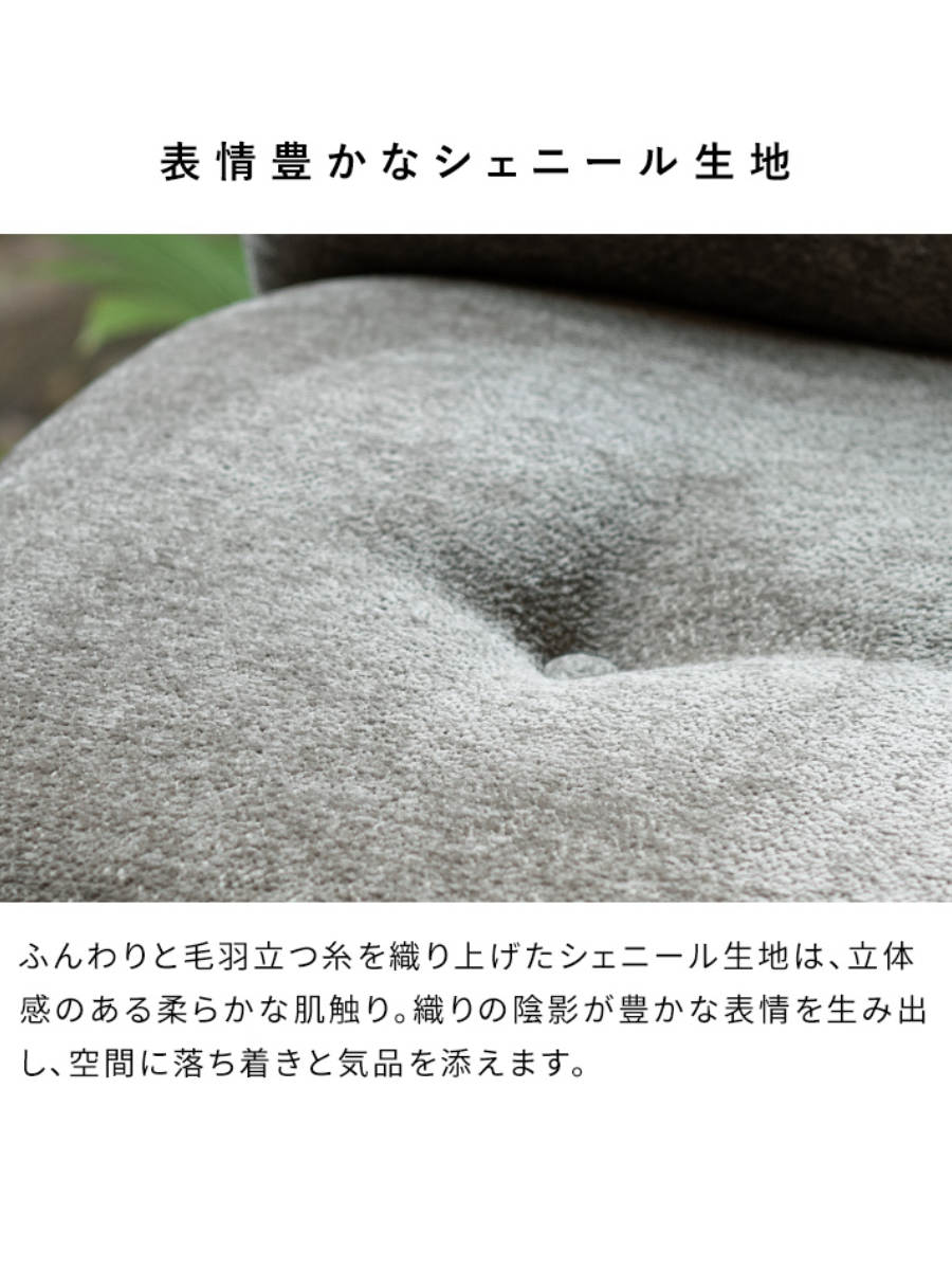 ふんわりと毛羽立つ糸を織り上げたシェニール生地は、立体感と深みのある表情が魅力。やわらかな肌触りで、空間に上質さと温もりを添えます。