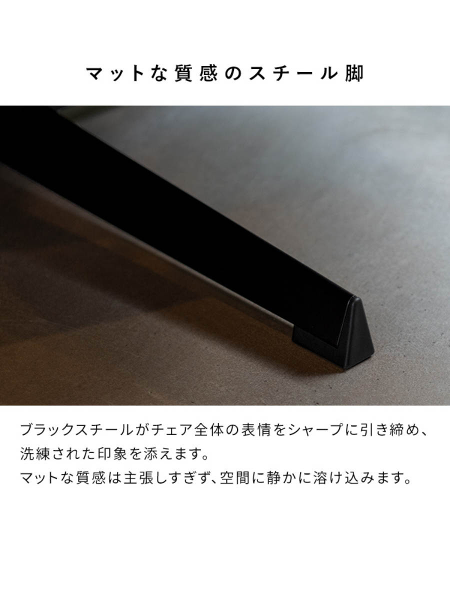 ブラックスチールの脚部が全体を引き締め、モダンで洗練された印象。マットな質感が空間に自然になじみます。耐荷重約80kgのしっかりとした構造で、粉体塗装仕上げにより水や汚れにも強く、美しさを長く保ちます。