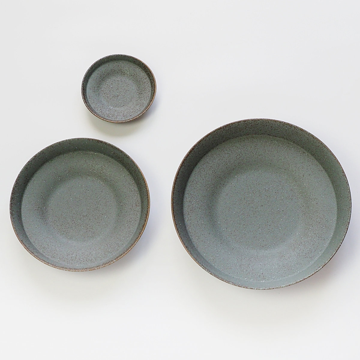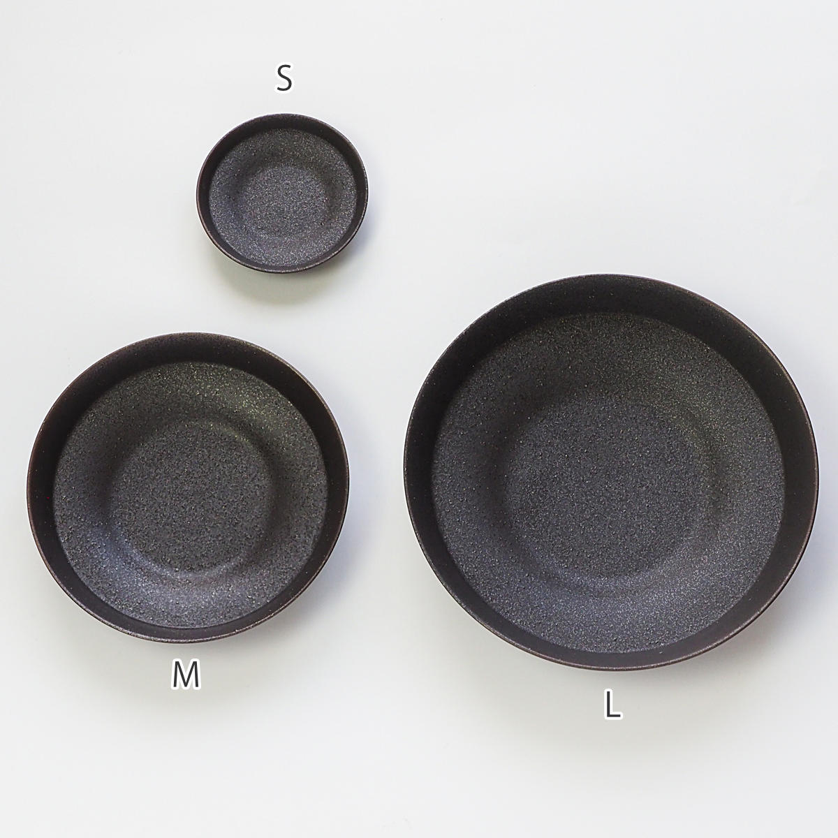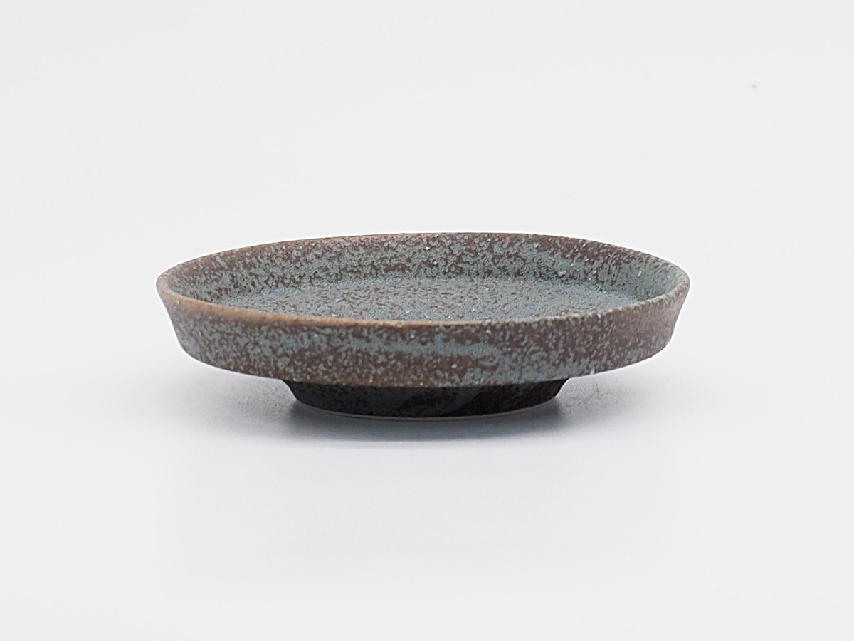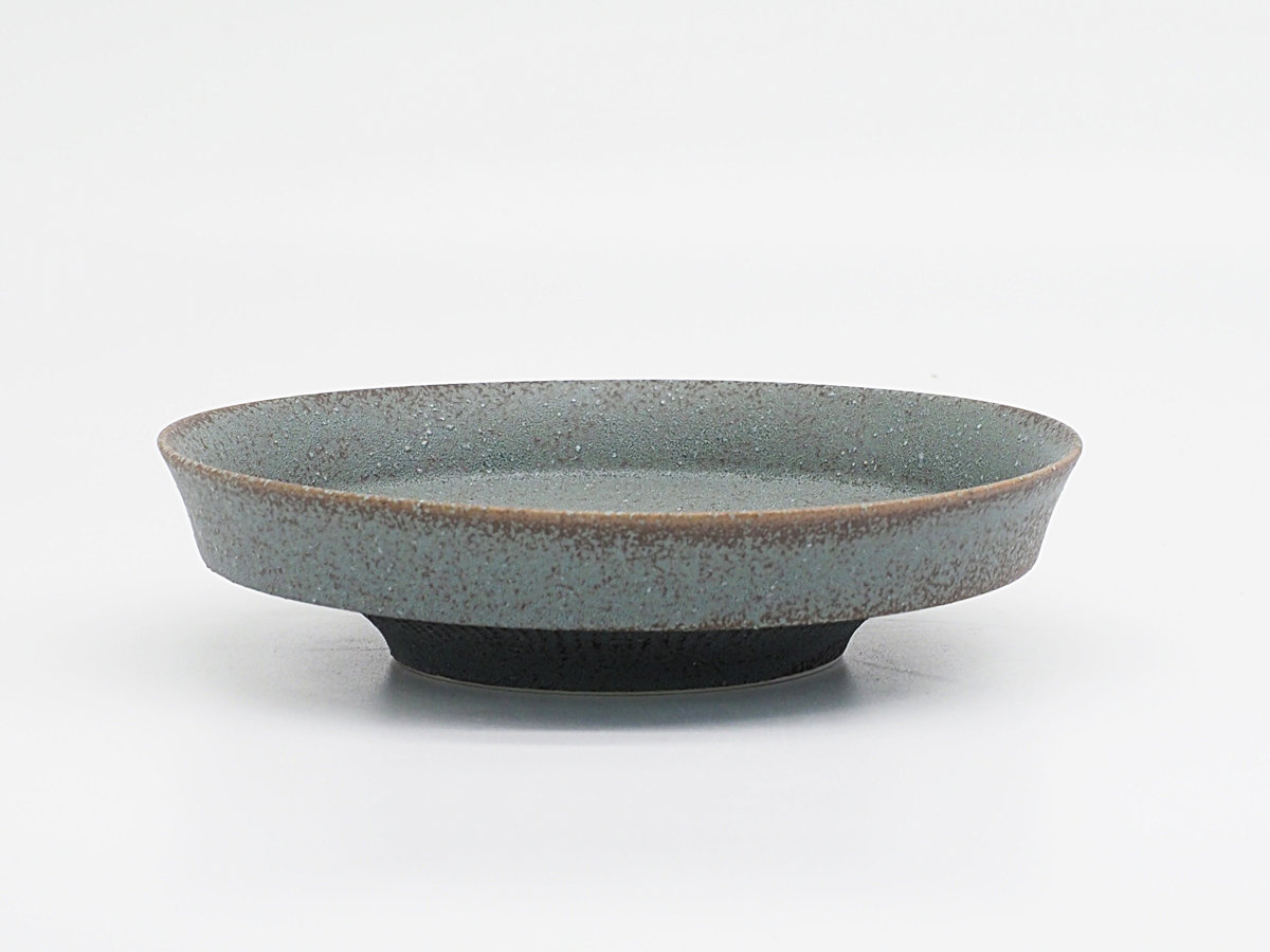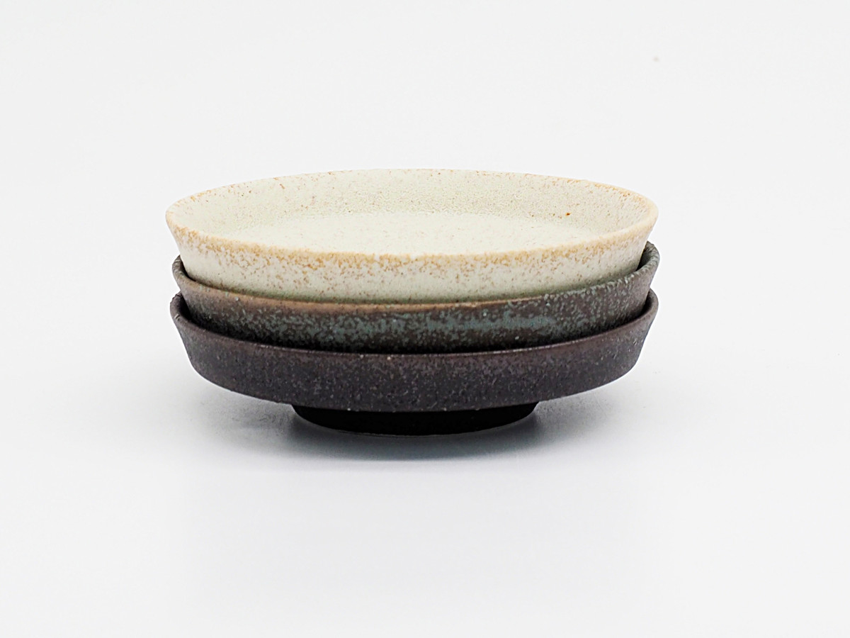 底が少し凹んだ特殊な形状のお皿です。その凹みが自然と「ここに盛ろう」というガイドになり、盛り付けた料理がぐっと映えます。表面はザラッとした質感とシックな色合いで、和洋問わずどんな料理にも馴染みます。少量のおかずや副菜、フルーツやデザートに使いやすいSサイズです。