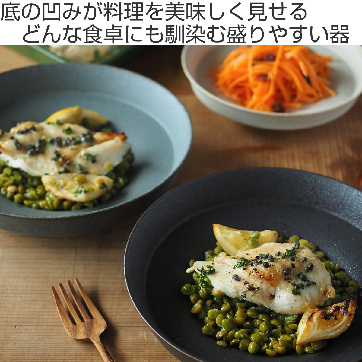 器の底の脚部分が高めに設計されており、器そのものがテーブルで少し浮いたような印象になり、より一層料理を引き立ててくれます。縁が高く深めのお皿なので、汁気のあるおかずも安心です。